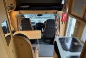 As we head towards the front of the motorhome, we come to the lounge/dining area where there are the rear two travelling seats. At the front there are driver and passenger seats that both swivel to face the large dining table that is positioned in between that offers that warm family dining experience. These seats together also convert to make a single bed. Above the cab is the second large double bed which can easily accommodate 2 adults.
