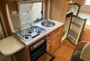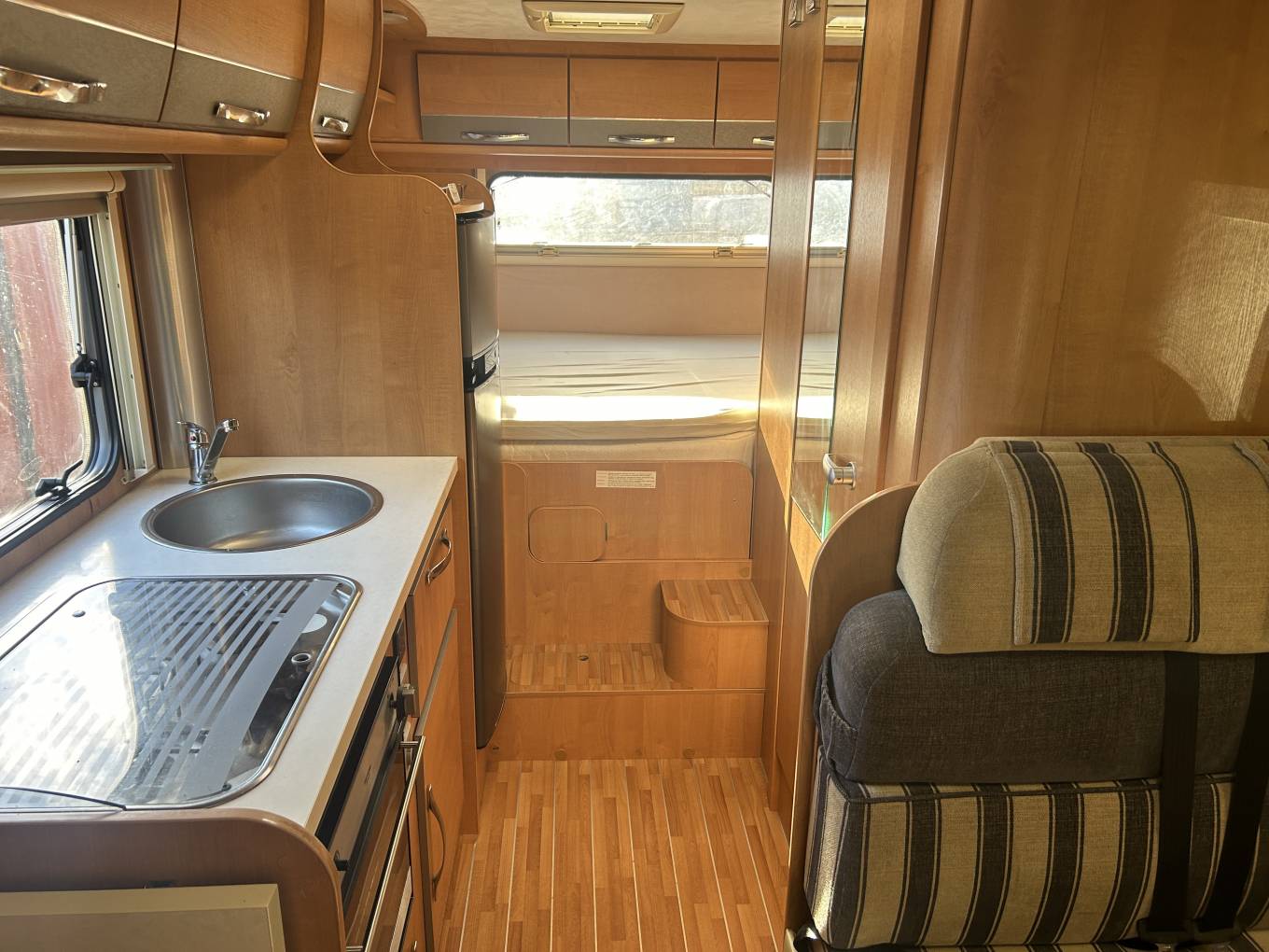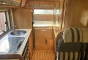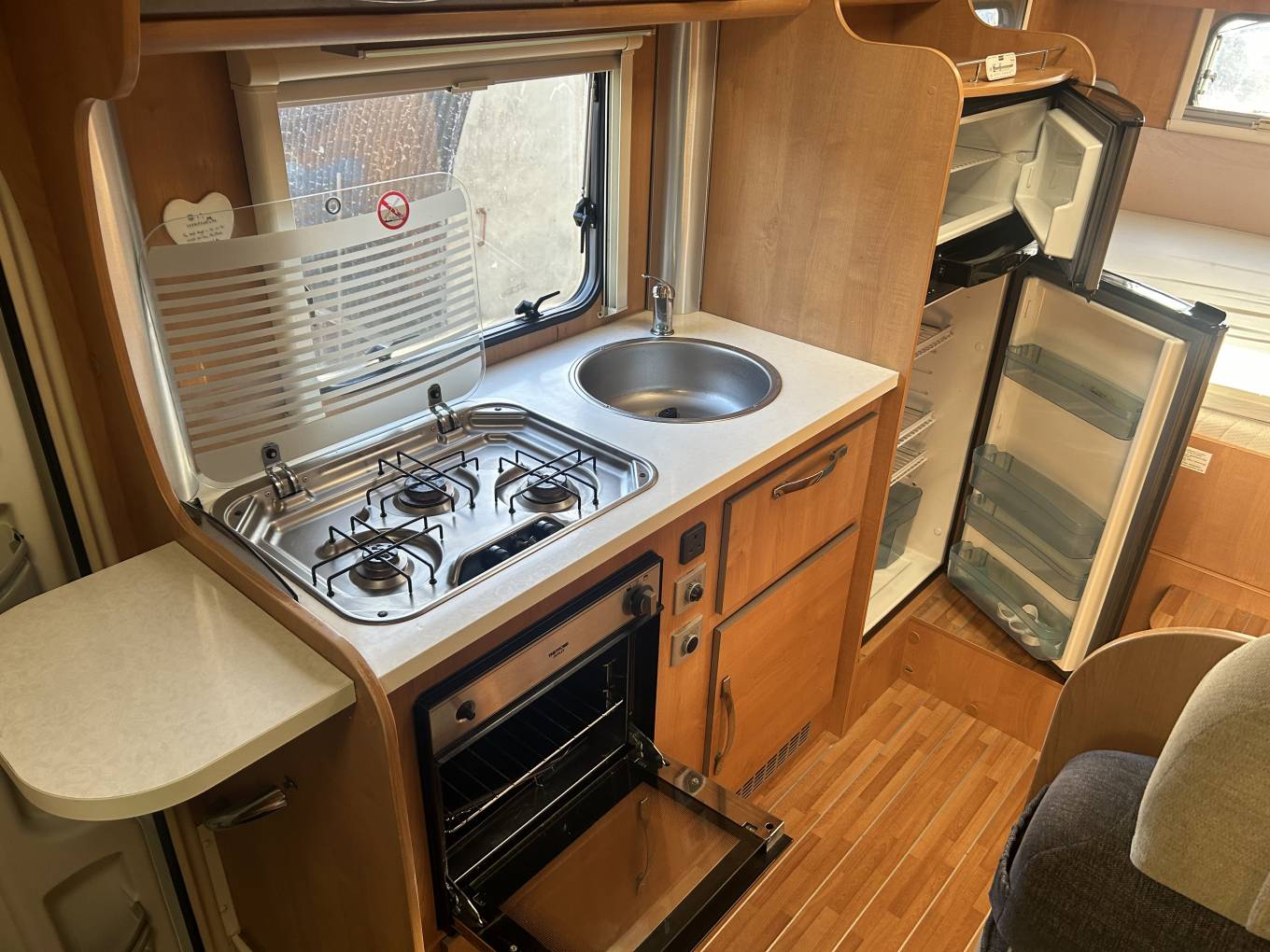 The 600g has an excellent layout for a family motorhome - as you step in the habitation door there is a good sized double dinette style seating area and table straight in front, ideal for a place to relax, enjoy a meal, snack or even browse a tablet or laptop. The motorhome has an extremely well equipped kitchen that features an oven, grill, hob with 3 gas burners, sink with mixer tap and large fridge with separate freezer.