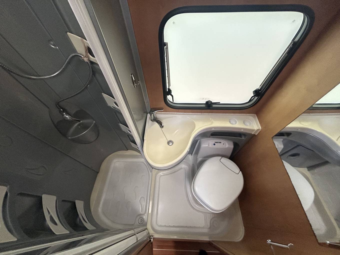 This Rollerteam is extremely comfortable to sleep in, it has a large transverse bed at the rear, a further large double over the cab and a smaller 3 double that can be made out of the double dinette. It also has a good sized washroom with Thetford flush cassette toilet, sink and shower. Heating and hot water is provided by the Truma boiler.