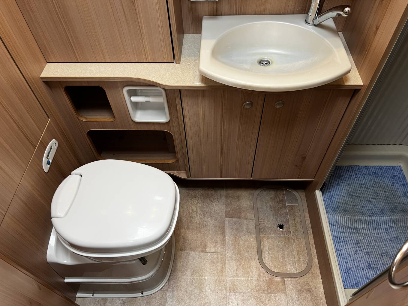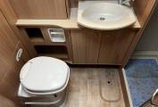 Through the central rear door into the rear bathroom equipped with a Thetford Flush Cassette Toilet, a Wash Handbasin, a Shower Cubicle, a Wardrobe and more cupboards.