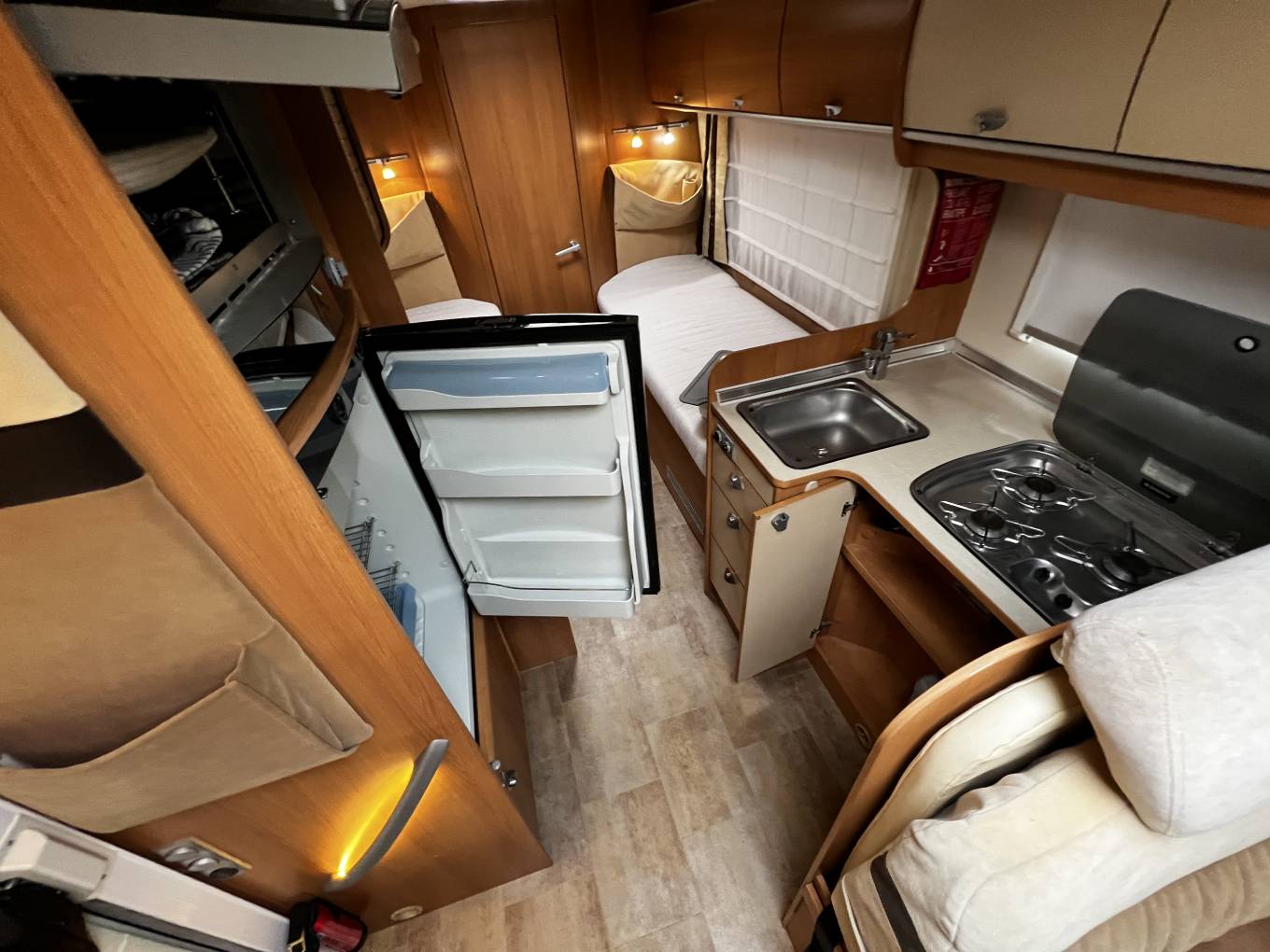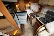 Across the centre of the motorhome is the fully equipped kitchen consisting of a Three Burner Gas Hob, a Three Energy Source Dometic Fridge with an Oven/Grill above, a Sink with a Hot and Cold Mixer Tap, an extendable worktop space plus plenty of cupboards and drawers.