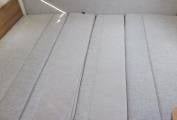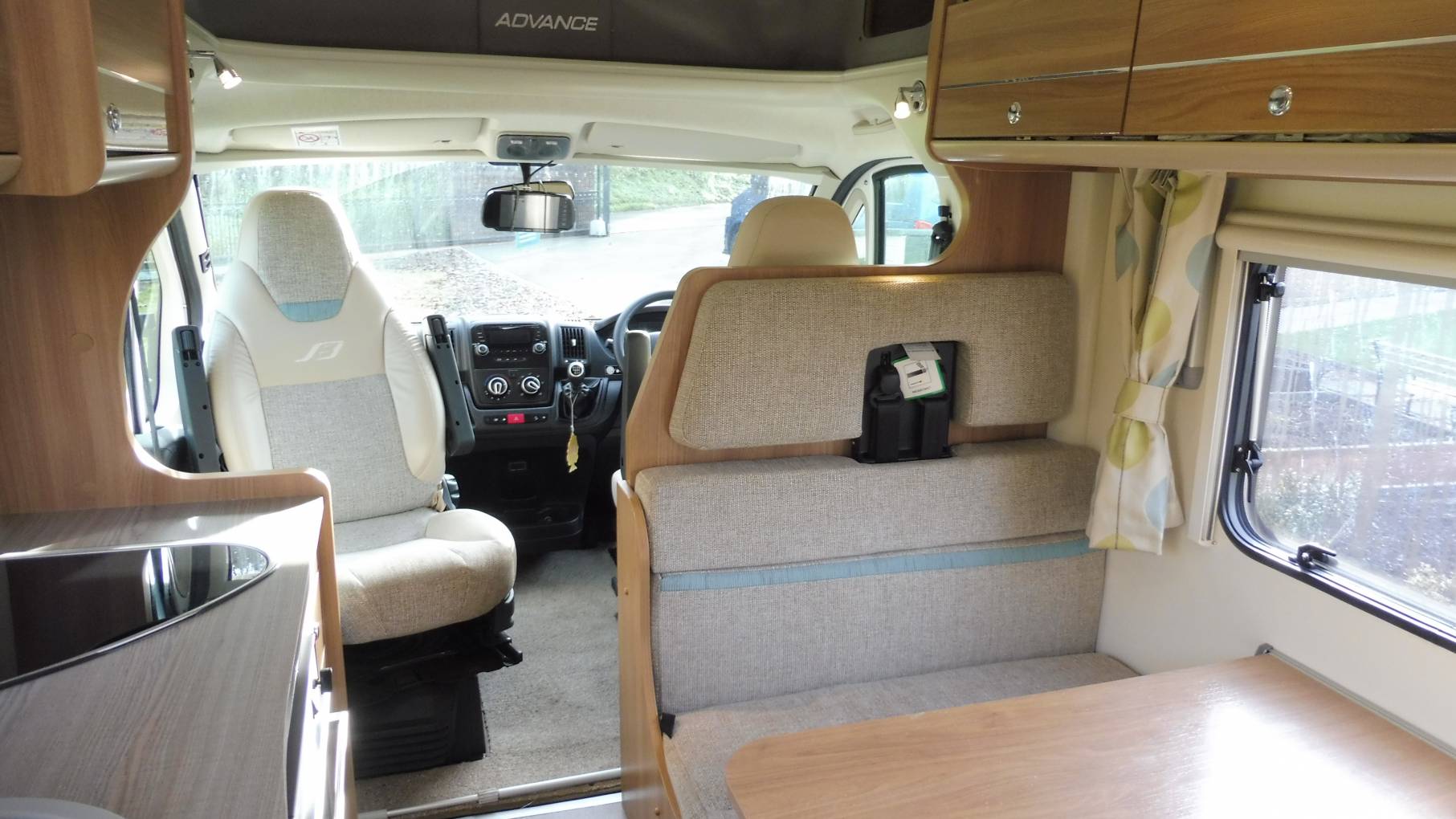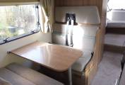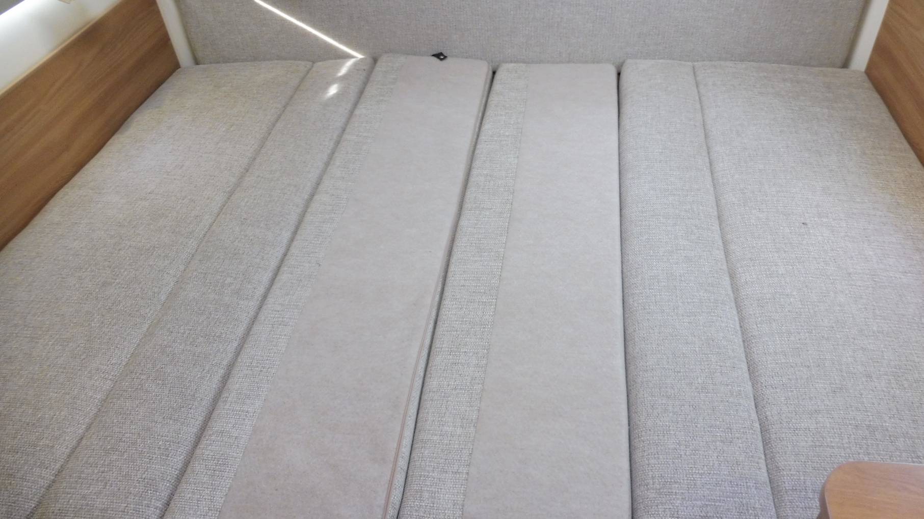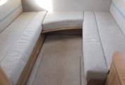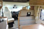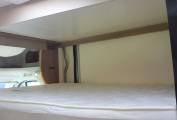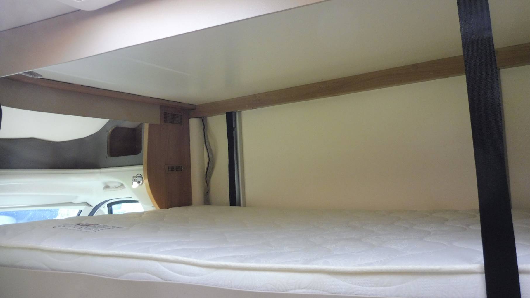 The front dinette allows for 4 people Pullman-style. Above the dinette the electric drop-down bed is positioned longitudinally and not transverse across the width of the habitation space, taking up only half of the vehicle’s width, a corridor is retained through the motorhome, even when the bed is lowered. It is a good size bed, accessible via a ladder, since it lowers about halfway down the height of the interior in order to retain sufficient headroom for the dinette bed underneath it, which is easy to make up into a further small double bed.