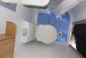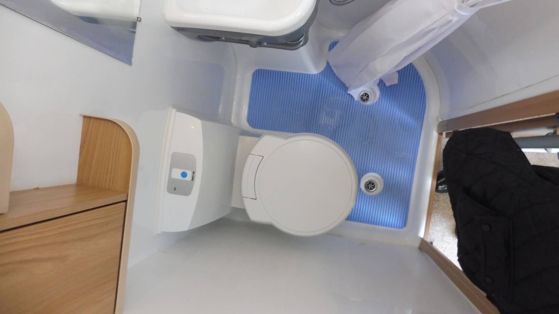 The central washroom has a swivel cassette toilet, medicine cabinet, mirror, skylight and an integral shower, which includes the washbasin. Opposite the washroom is a large wardrobe with hanging rail.