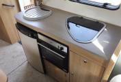 The kitchen is well equipped with worktops and overhead lockers. The sink is a circular unit with a separate drain cover. The cooker is a Thetford Duplex unit with a combination oven and grill and three gas burners. A Sharp microwave and Dometic fridge freezer are included.