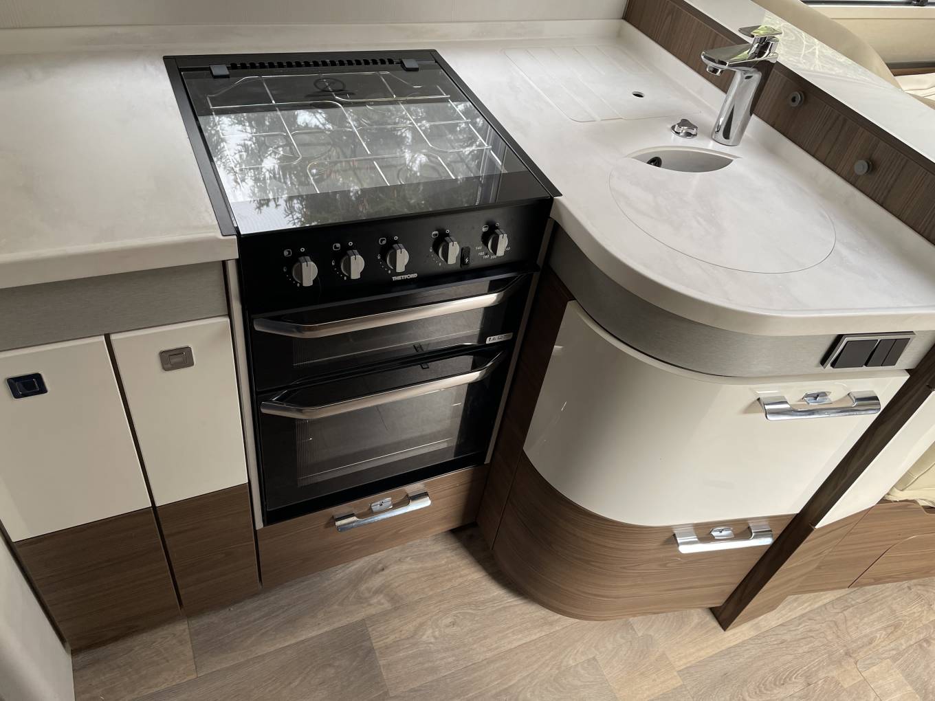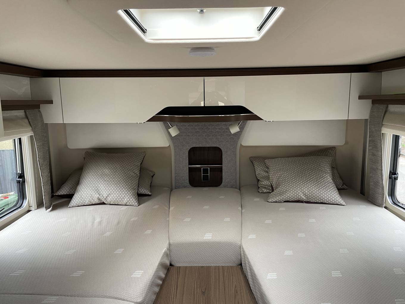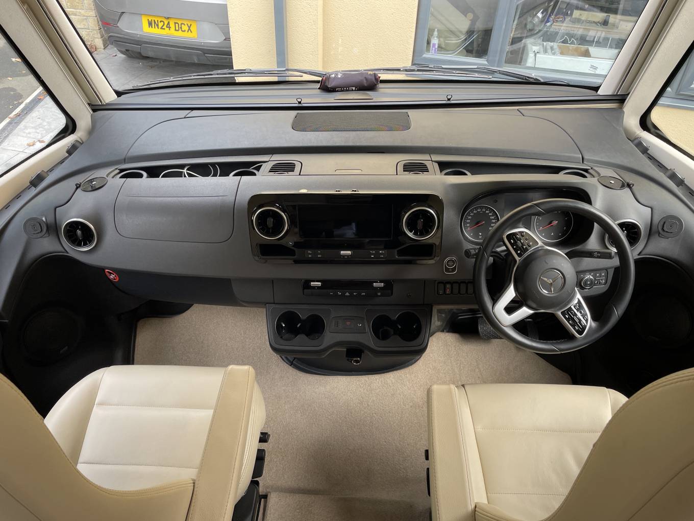 Motorhome Depot are delighted to present this superb 2022 Hymer B-Class Masterline I 880, a top of the range premium tag axle motorhome with a superb specification and benefitting from Hymers legendary build quality married to the supremely smooth Mercedes Benz engine and automatic gearbox. The Hymer has a great layout and plenty of space, starting at the rear you have a bedroom area with twin single beds that easily convert into a full width king size. This stylish area has a range of overhead lockers and storage cupboards under both beds and a Smart TV. The bedroom has a sliding door which leads to the shower cubicle, washroom and dressing area. This area has privacy doors from both the main living area and the bedroom and plenty of storage space. The living area is stylish great for relaxing or entertaining. The kitchen is fully equipped with a Thetford oven, grill and hob, a large fridge freezer, sink and drainer and plenty of storage space. The lounge/dining area is luxurious with, twin swivelling Captain’s seats, an L shaped sofa and a separate side sofa around a round extending pedestal table. The seating is finished in high quality cream leather, a concealed 32inch Smart TV is raised by an electric motor. There is a large comfortable drop down double bed above the cab. The stylish cab area makes travelling a pleasure, with the quality of Mercedes Benz evident, the auto box and cruise control ensure effortless cruising. The cab also benefits from a reversing camera, electric roller windscreen blind and android/CarPlay. The rear garage has large doors on both sides. The specification & extras are very impressive including, hab air con, an electric 6m Thule awning , 3 x lithium batteries with management system, solar panel, 5G Wi-Fi, Scorpion tracker, Cat 1 alarm system, Gas-It refillable LPG system with 2 x 11kg bottles, 1800w Puresine inverter an external BBQ point and much more! The Hymer is 8.99m long, 2.35m wide and has a max weight of 5,500 kg. Whether you are travelling in the UK or exploring Europe it is an unbeatable package.