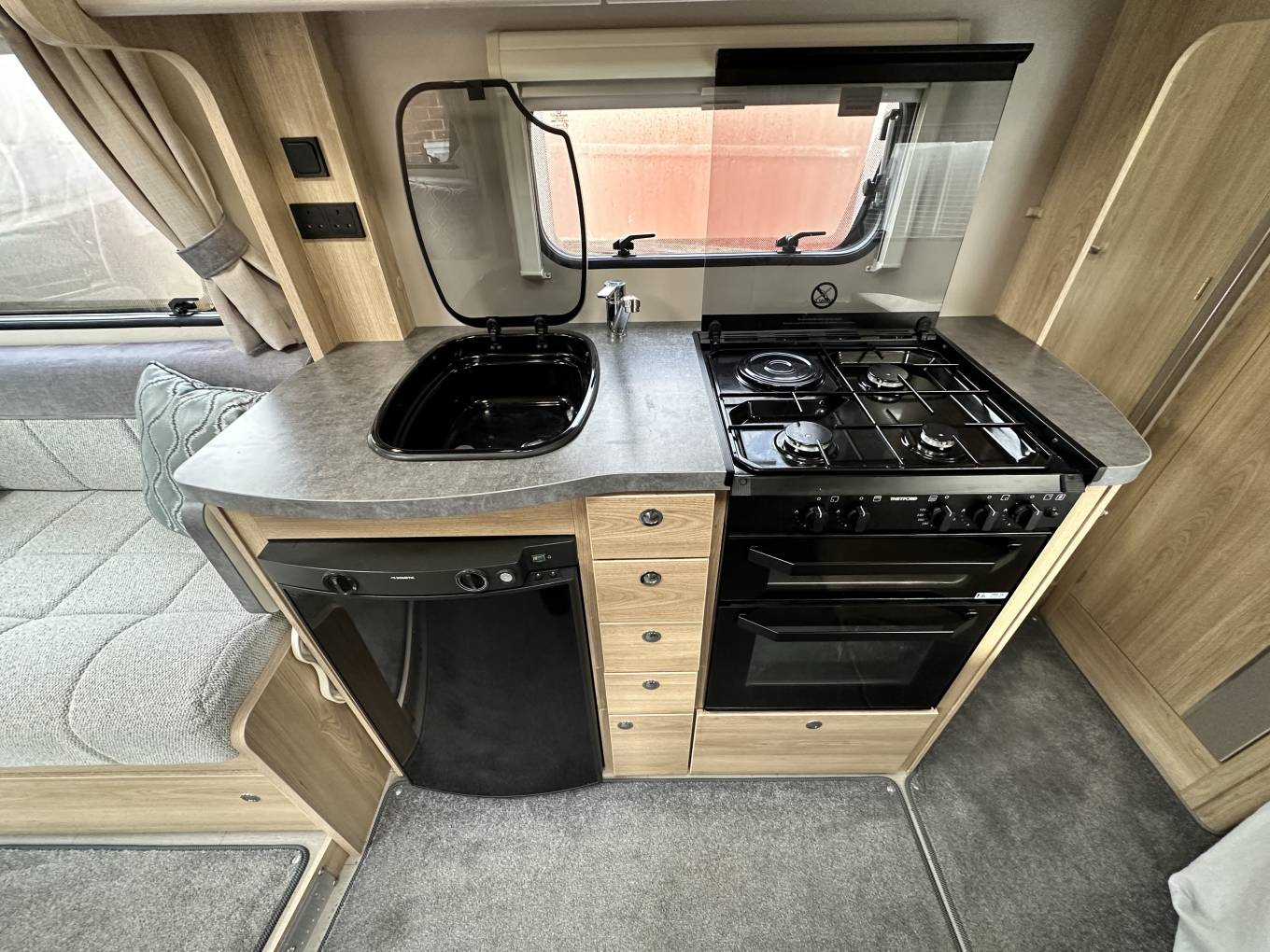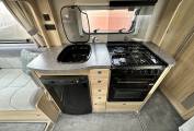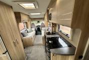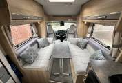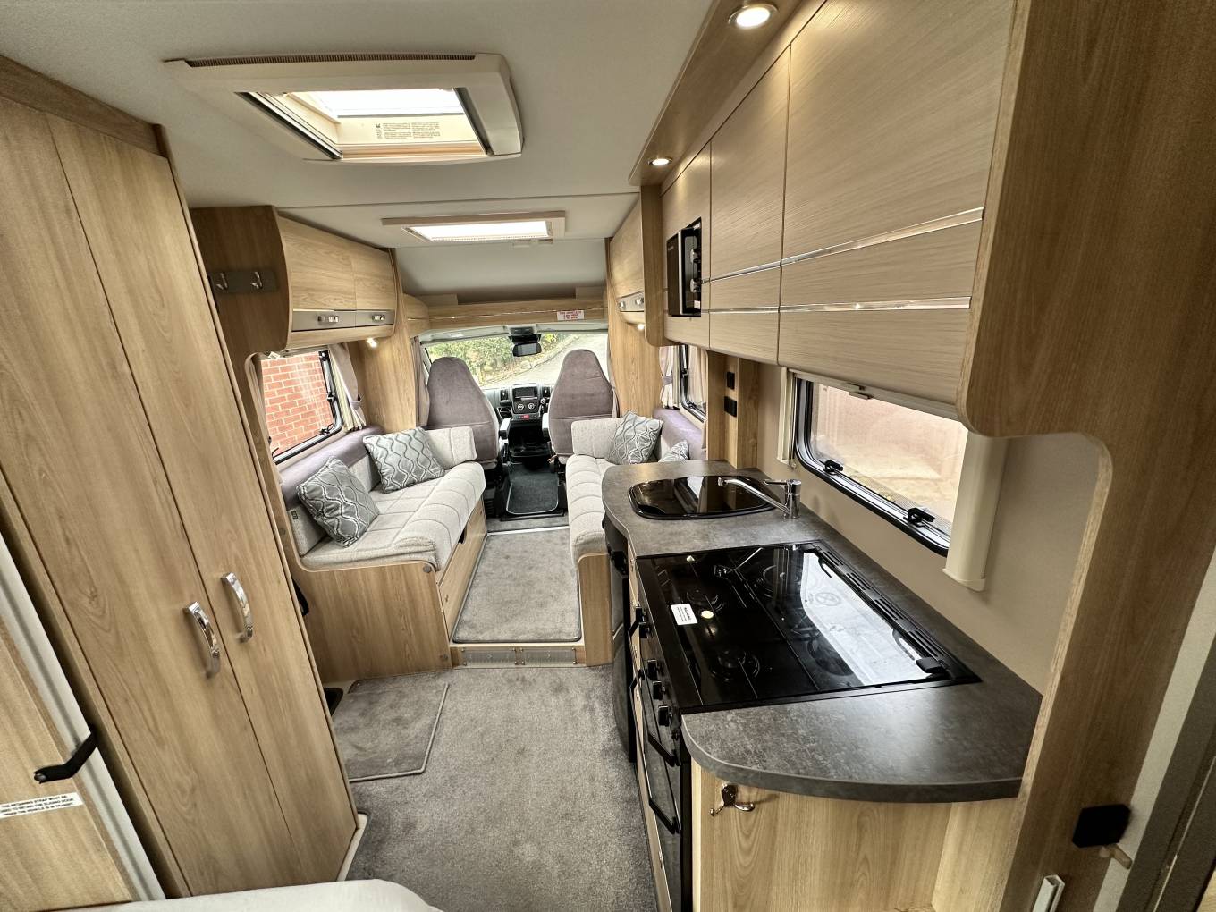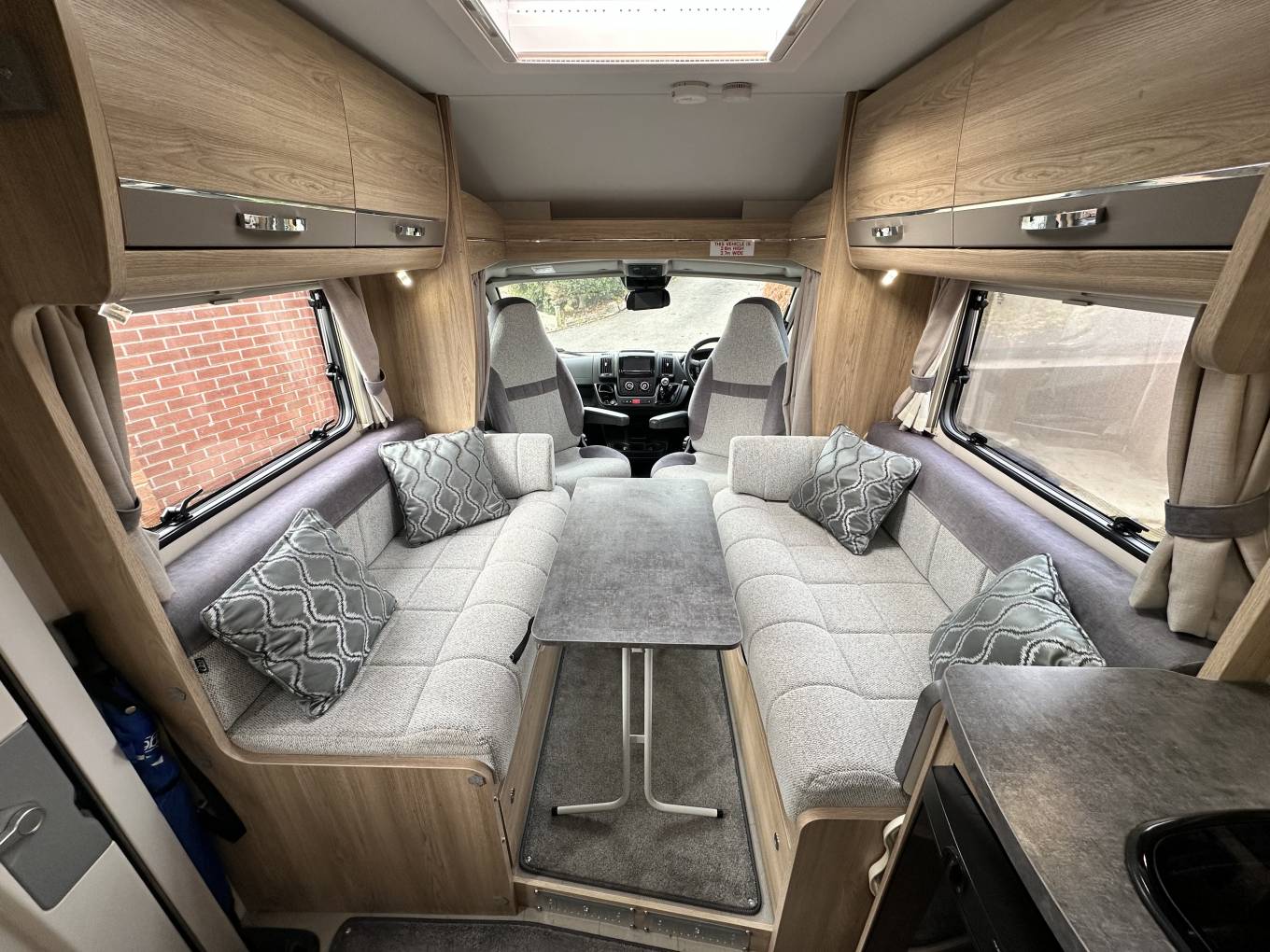 At the rear of the motorhome, you will find the popular french style fixed rear bed. There is ample storage including a wardrobe at the foot of the bed and under bed storage which is accessed easily by the air sprung struts. Moving forward you will find the modern practical washroom which has everything you need to keep yourself fresh on your travels including a shower, a fold down wash basin with a mixer tap, a Thetford cassette toilet with electric flush, a vanity cupboard and a large mirror. Adjacent to this you will find the well equipped kitchen area including 3 burner gas hob, grill, oven, microwave, 3 way fridge with freezer compartment and plenty of storage. In the heart of the motorhome, you will find the light and airy dinette area complete with fold-out travel seats so four can travel in safety. Utilising the front two swivel captain seats and the removable table this easily seats up to 6 people. As the night draws in, this area effortlessly converts in to a second double bed.