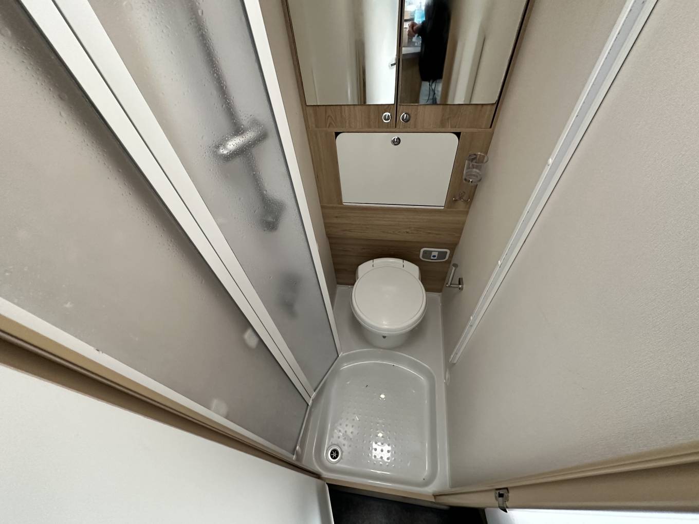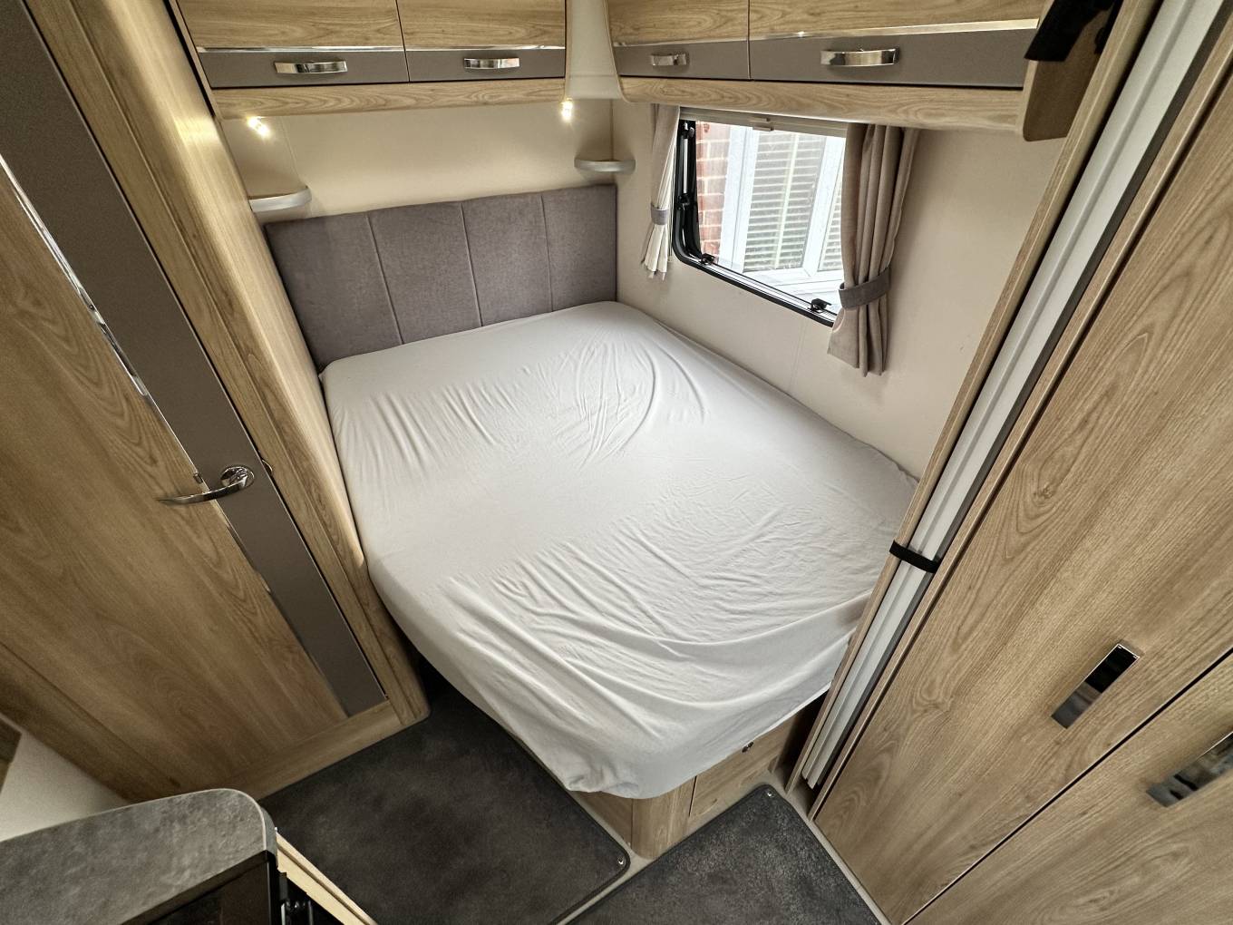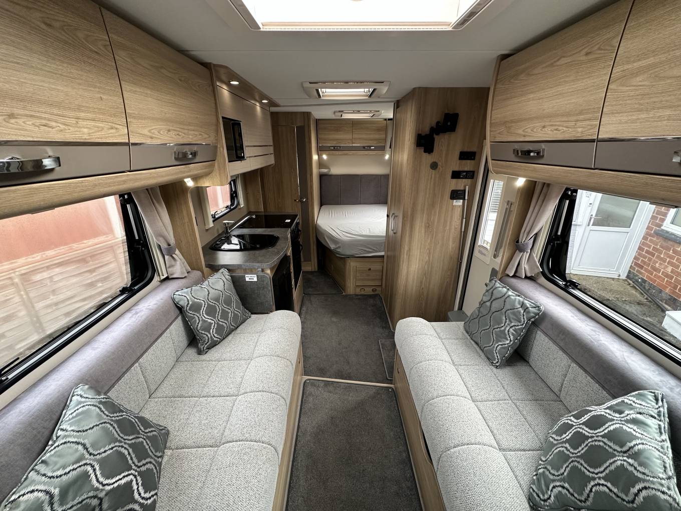 At the rear of the motorhome, you will find the popular french style fixed rear bed. There is ample storage including a wardrobe at the foot of the bed and under bed storage which is accessed easily by the air sprung struts. Moving forward you will find the modern practical washroom which has everything you need to keep yourself fresh on your travels including a shower, a fold down wash basin with a mixer tap, a Thetford cassette toilet with electric flush, a vanity cupboard and a large mirror. Adjacent to this you will find the well equipped kitchen area including 3 burner gas hob, grill, oven, microwave, 3 way fridge with freezer compartment and plenty of storage. In the heart of the motorhome, you will find the light and airy dinette area complete with fold-out travel seats so four can travel in safety. Utilising the front two swivel captain seats and the removable table this easily seats up to 6 people. As the night draws in, this area effortlessly converts in to a second double bed.