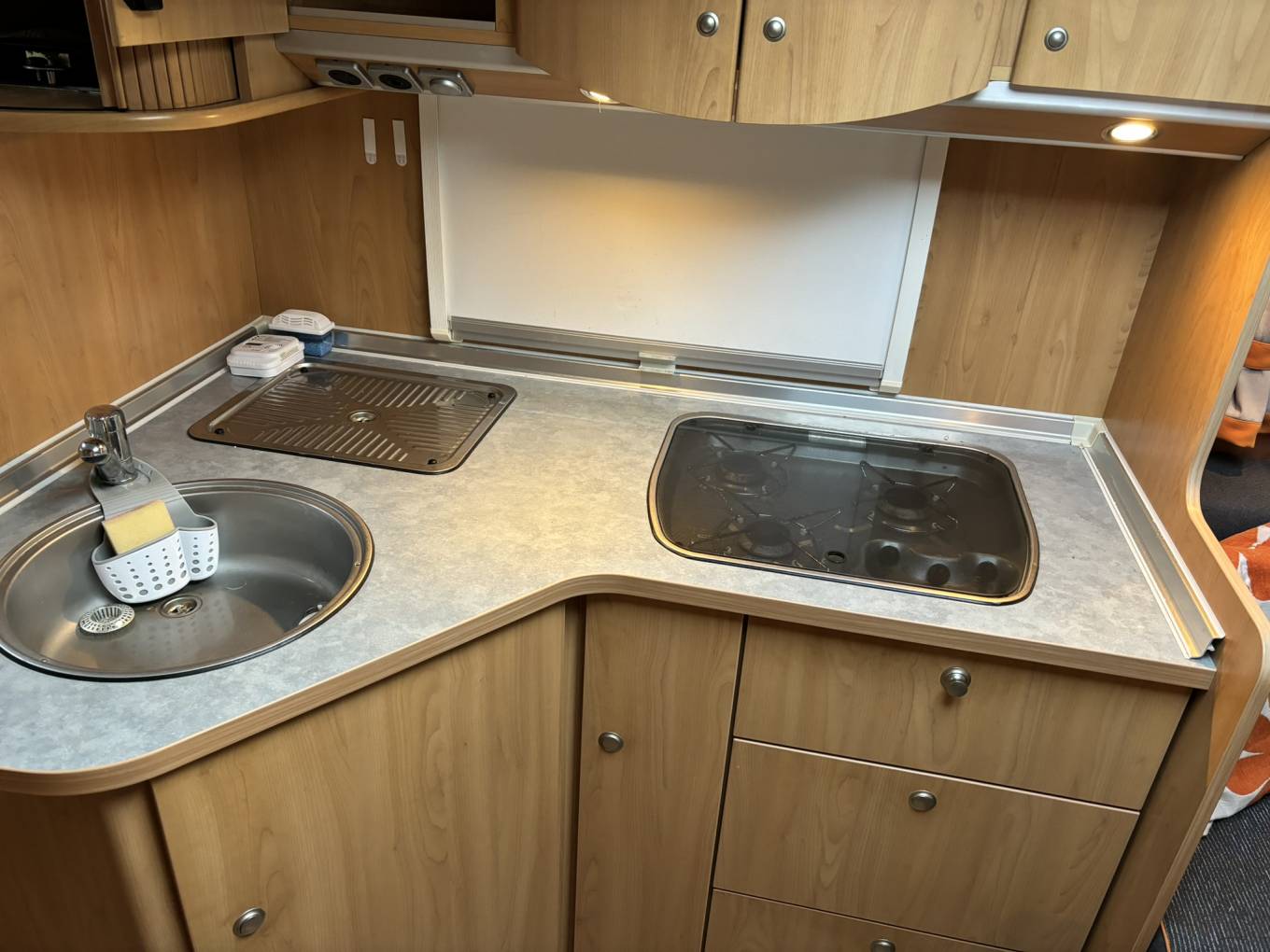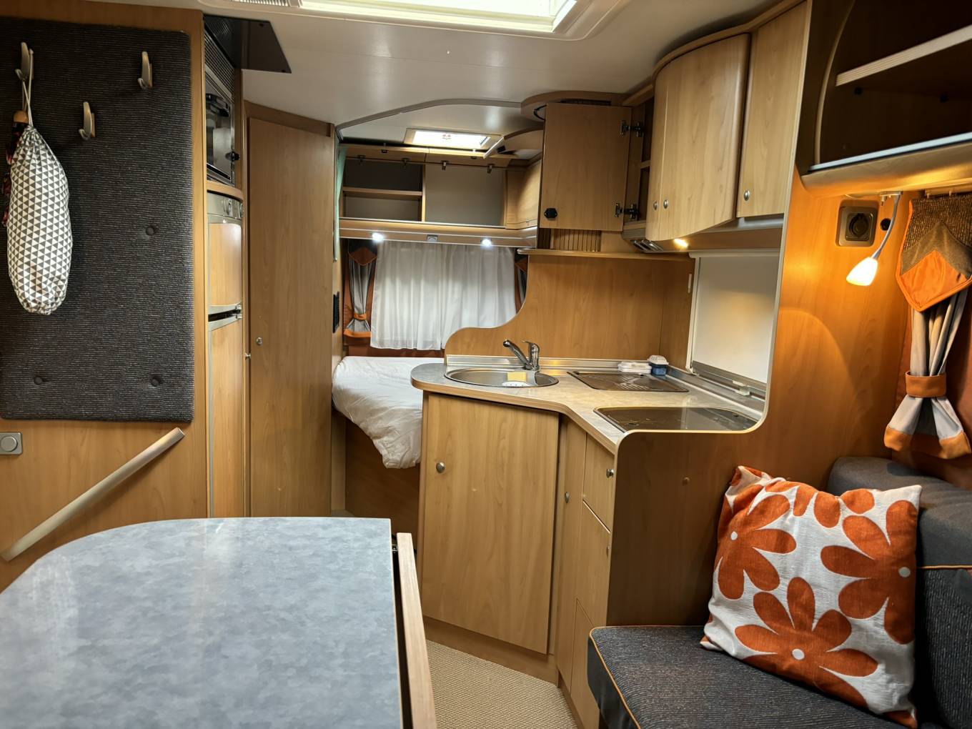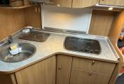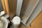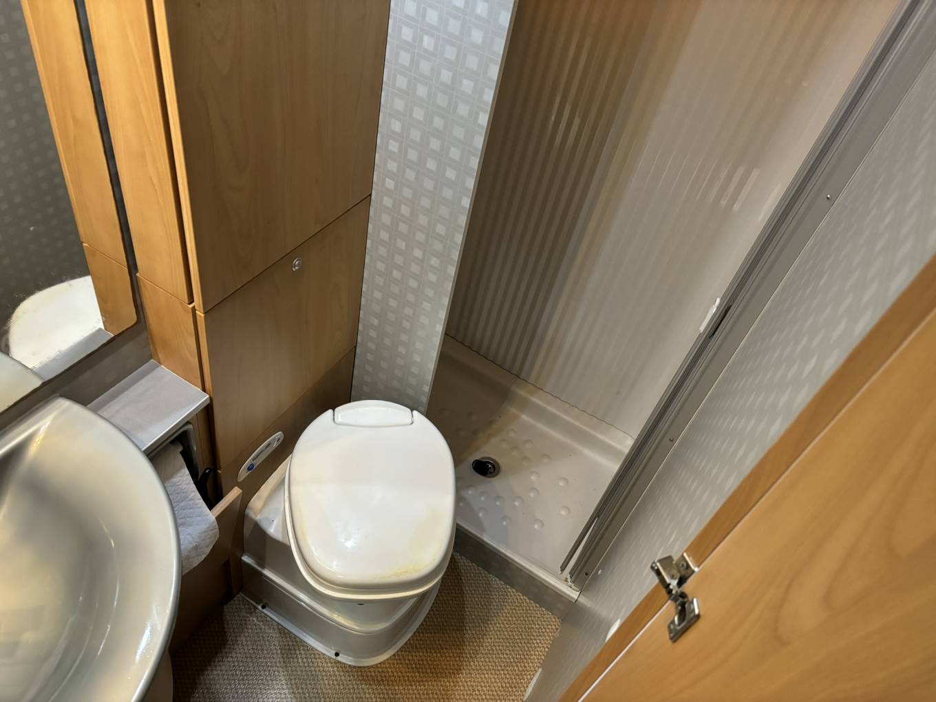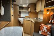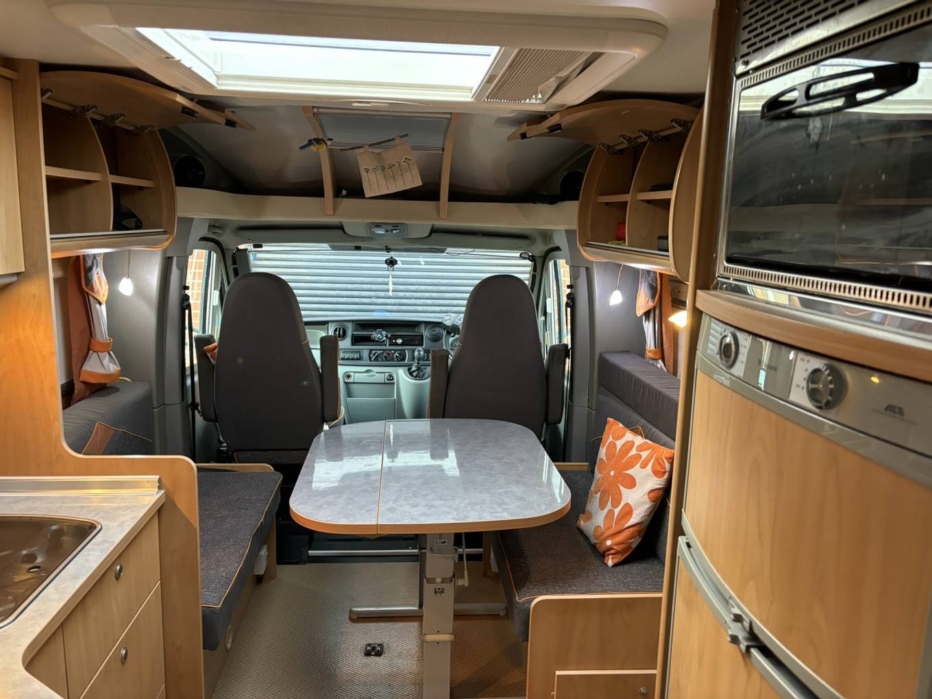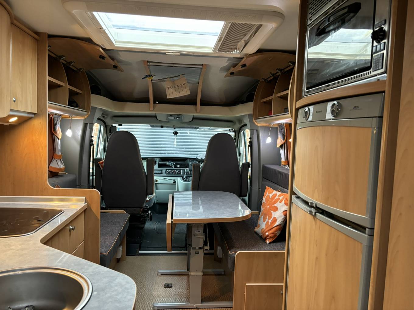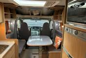 The interior of the Delfin T686 is designed for practicality, with ample storage space, a fully equipped kitchen (hob, fridge, sink , microwave), and a compact but functional bathroom with a shower and toilet. It also offers features like a swiveling driver's seat, fold-away tables, and LED lighting to enhance the living experience.