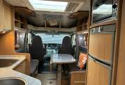 The T686 features a spacious U-shaped seating area, with a front driver's area that is integrated into the overall cabin design. This creates a cozy, functional living area. The motorhome is equipped with a fixed rear french bed and a foldout double bed from the seating area.