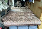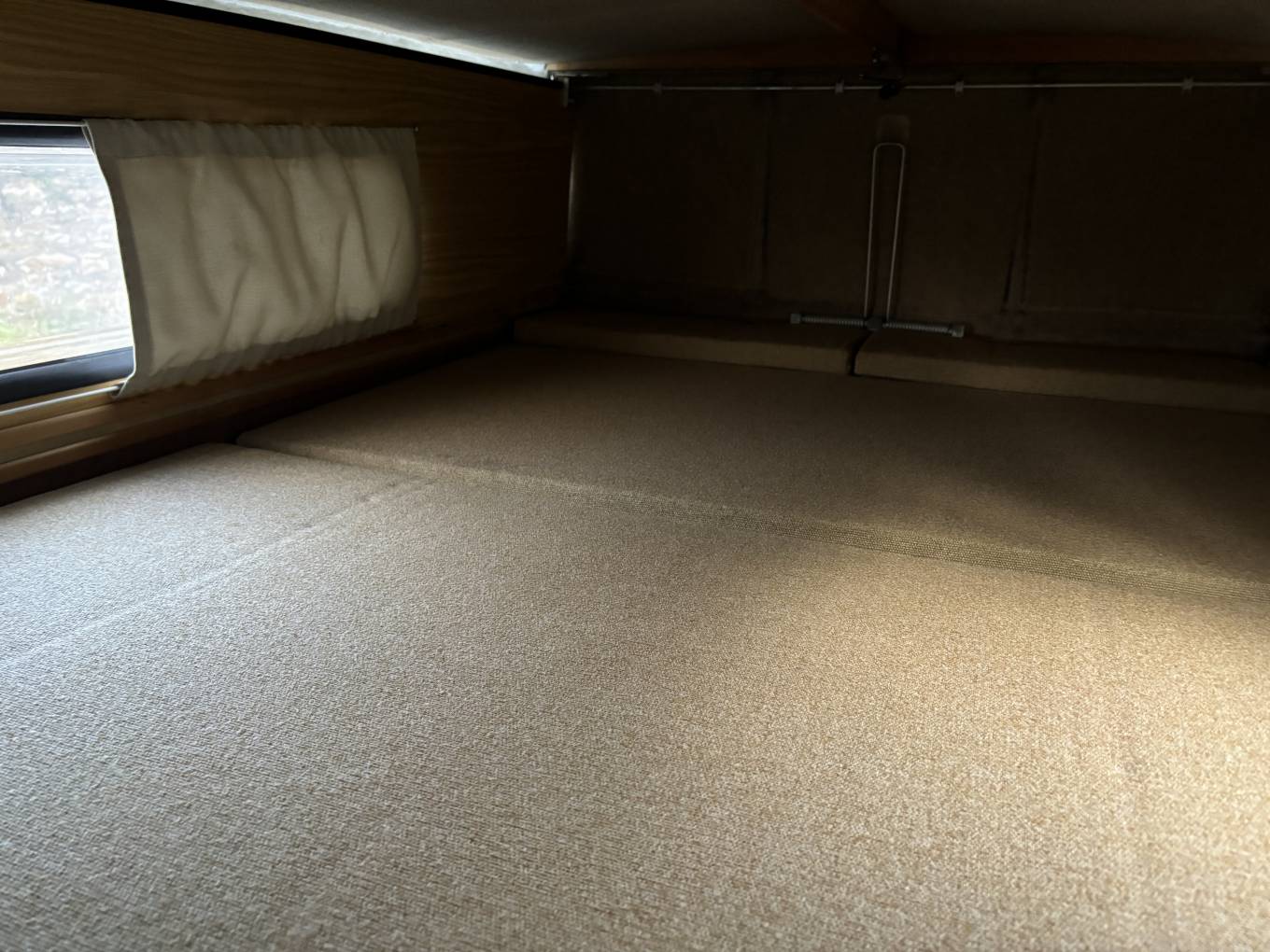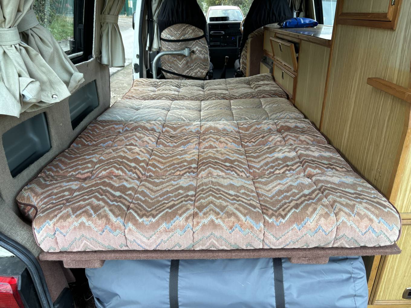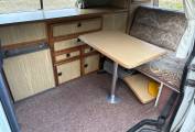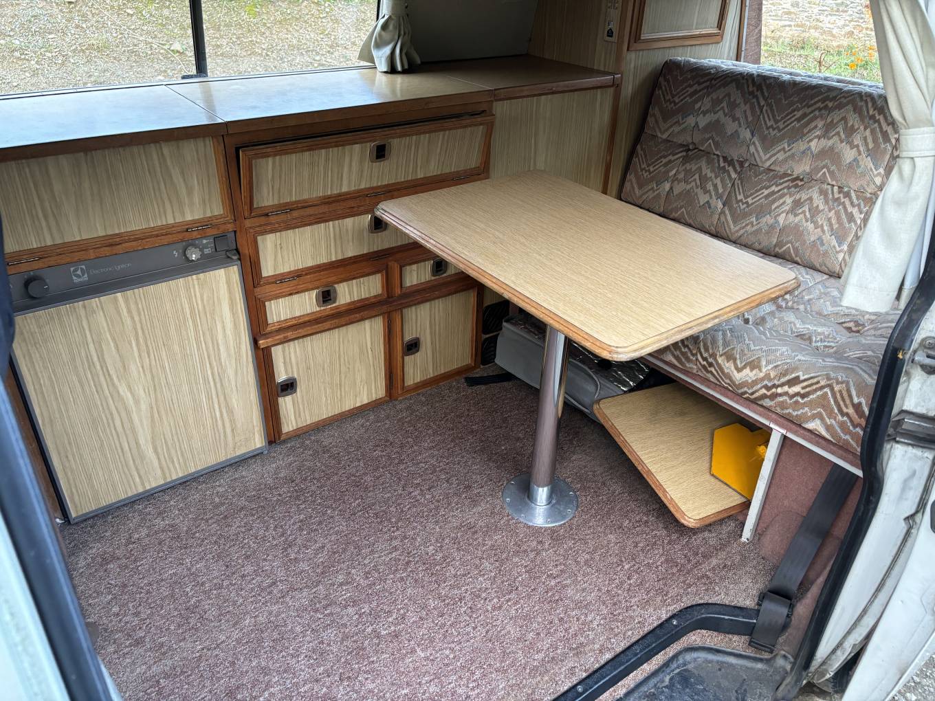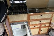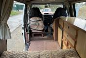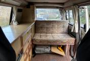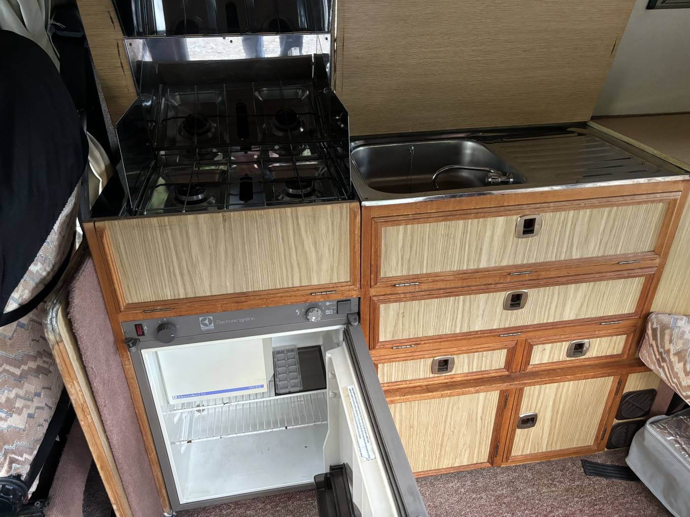 The living space has a rock and roll bed at the back which functions as the 2 belted seats and converts into a comfortable double bed, along with another double bed in the pop top. The kitchen area consists of a sink, 2 gas hobs, grill and fridge and there are 2 different sized fold away tables which can be utilised to form the dinette when eating.