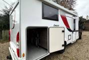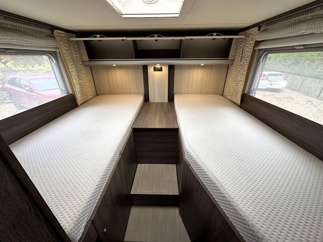 of the vehicle, you will find the twin single beds. Storage is ample, with wardrobes located beneath each of the beds and a number of eye-level lockers. The bed also sits above the large garage, which can be accessed