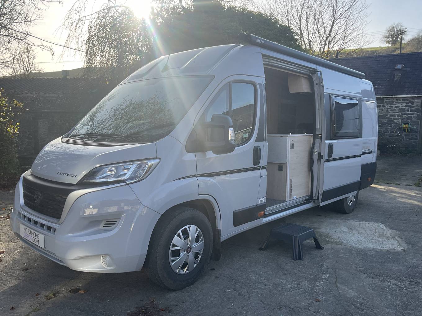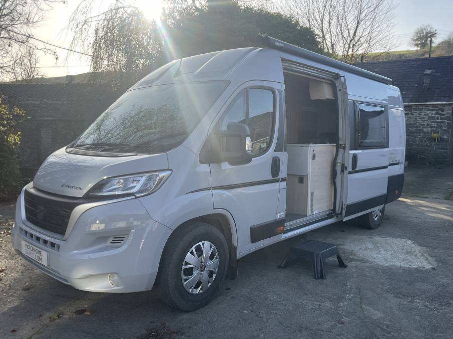 2023 Auto-Trail Expedition 68, 2 berth Camper for sale. Presented in lovely condition with low mileage and a great specification, this compact camper will suit for short trips away or extended breaks world wide. Built on the Fiat Ducato chassis with a 2.2l 140hp engine and a maximum weight of 3500kg which means a standard car licence is all that is required to drive this vehicle. This layout features a rear bed, above a large garage, mid ship kitchen, mid ship washroom and a front dinette with twin swivel chairs and 2 additional travel seats. Other features include, awning, solar panel with two leisure batteries, cab shades, cab air conditioning and cruise control, one 6kg gas bottle and 240v hook up lead.