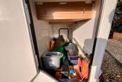 The kitchen sits in the middle of the motorhome, and is fully equipped with Thetford oven and grill, gas hobs and electric hotplate, Thetford fridge/freezer, Dometic microwave, sink and basin with hot and cold water, and plenty of storage for crockery, condiments and cutlery.