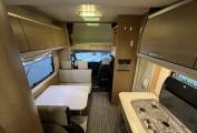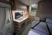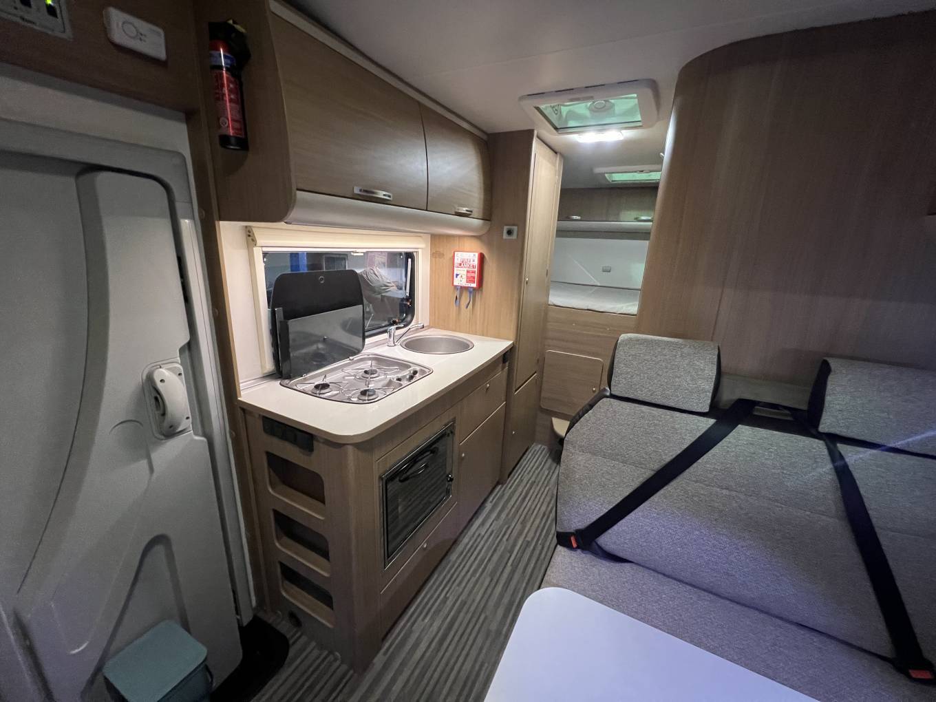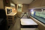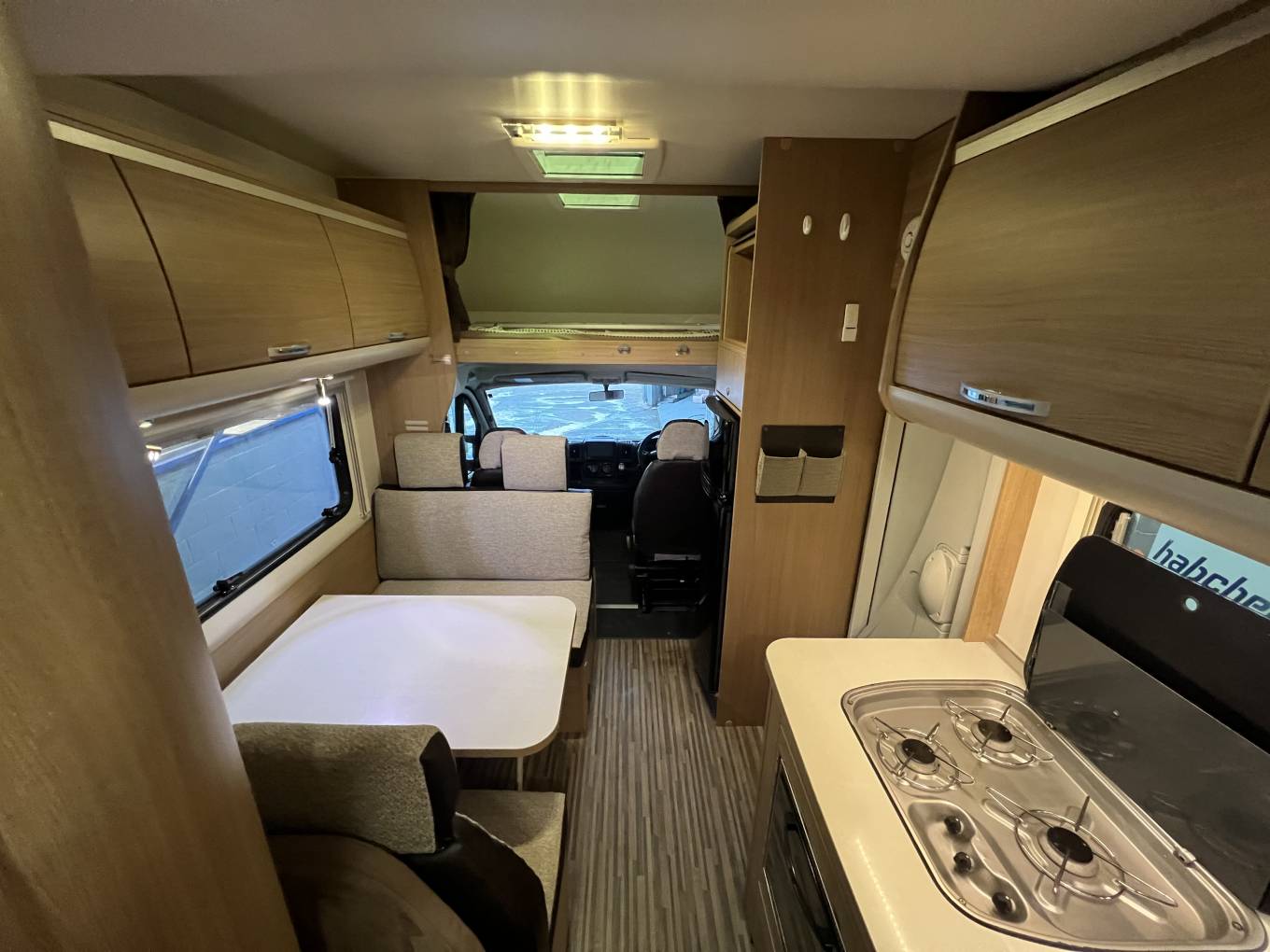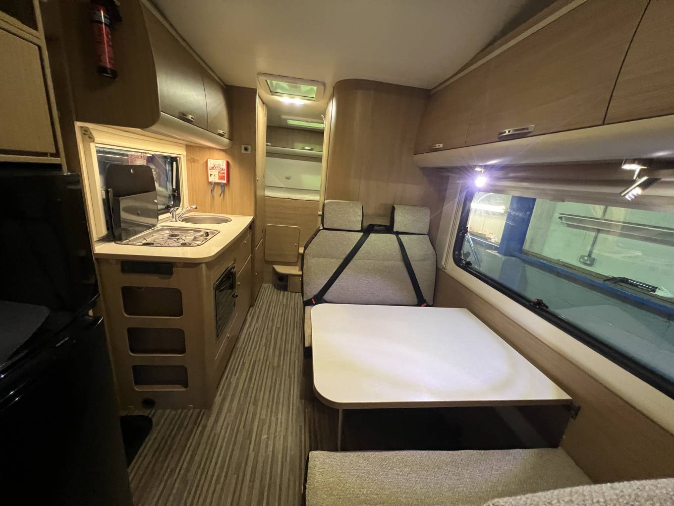 Mid habitation provides the main seating area which seats 4 people, two each side of the table, all seats come with belts with the forward facing seats coming with three point belts and the non-forward facing belts are lap belts. The seating area also transforms into a double bed.