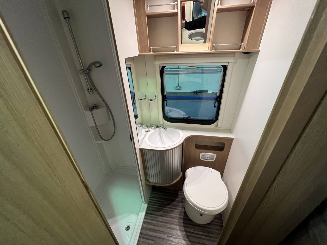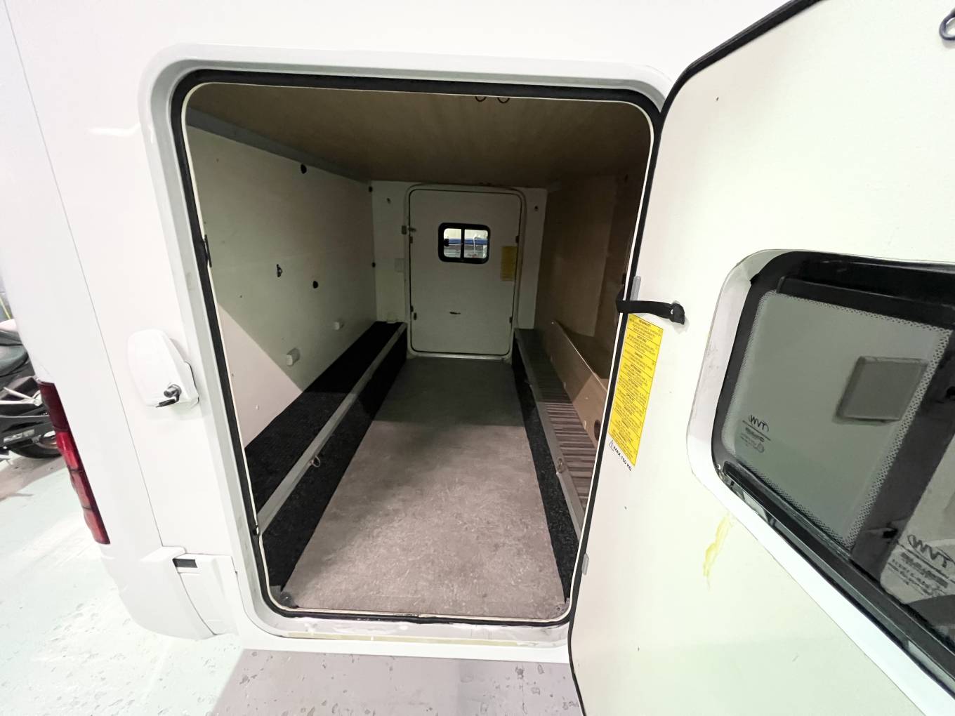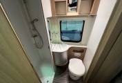 Starting at the rear, we have a large fixed transverse bed above the extremely spacious rear garage.Next to this we have a spacious washroom which comes with a desirable and generous separate shower cubicle, electric flush toilet and washbasin. Adjacent to the washroom is a spacious kitchen area that consists of a sink with mixer tap 3 ringed gas hob and large 3 way Fridge with separate freezer.