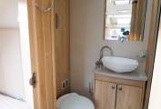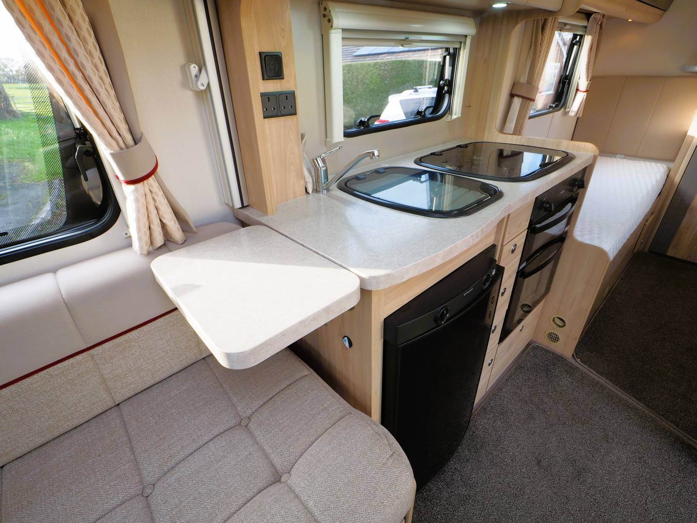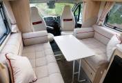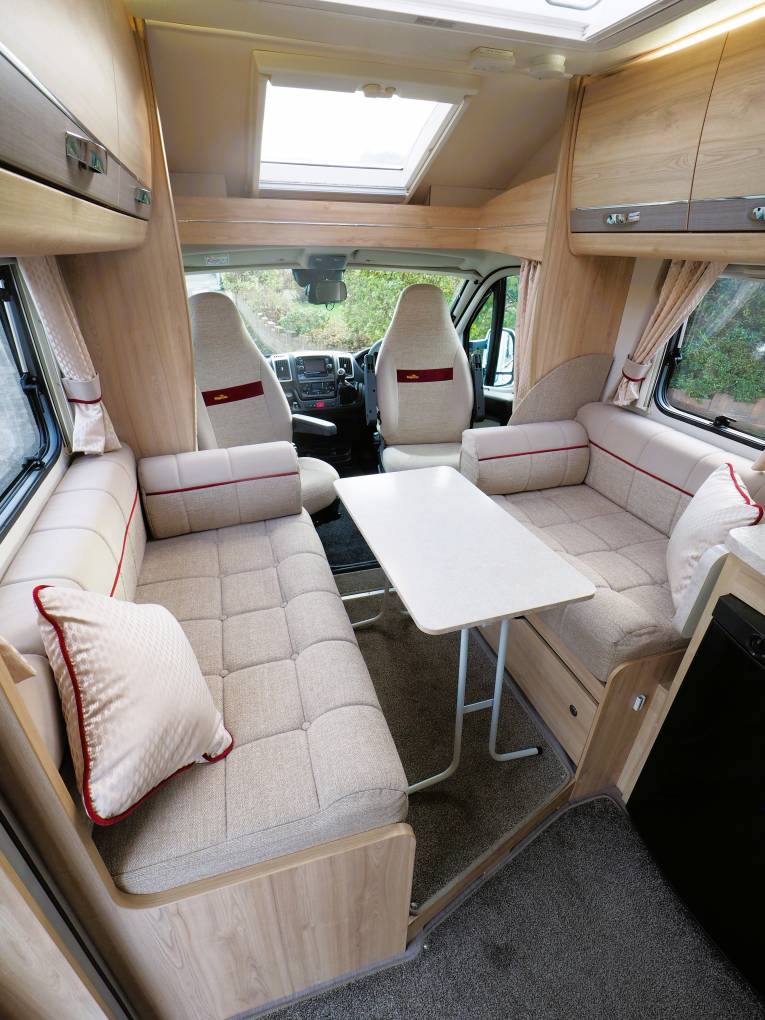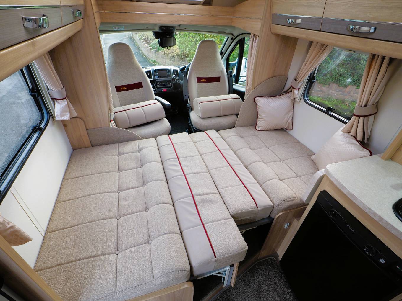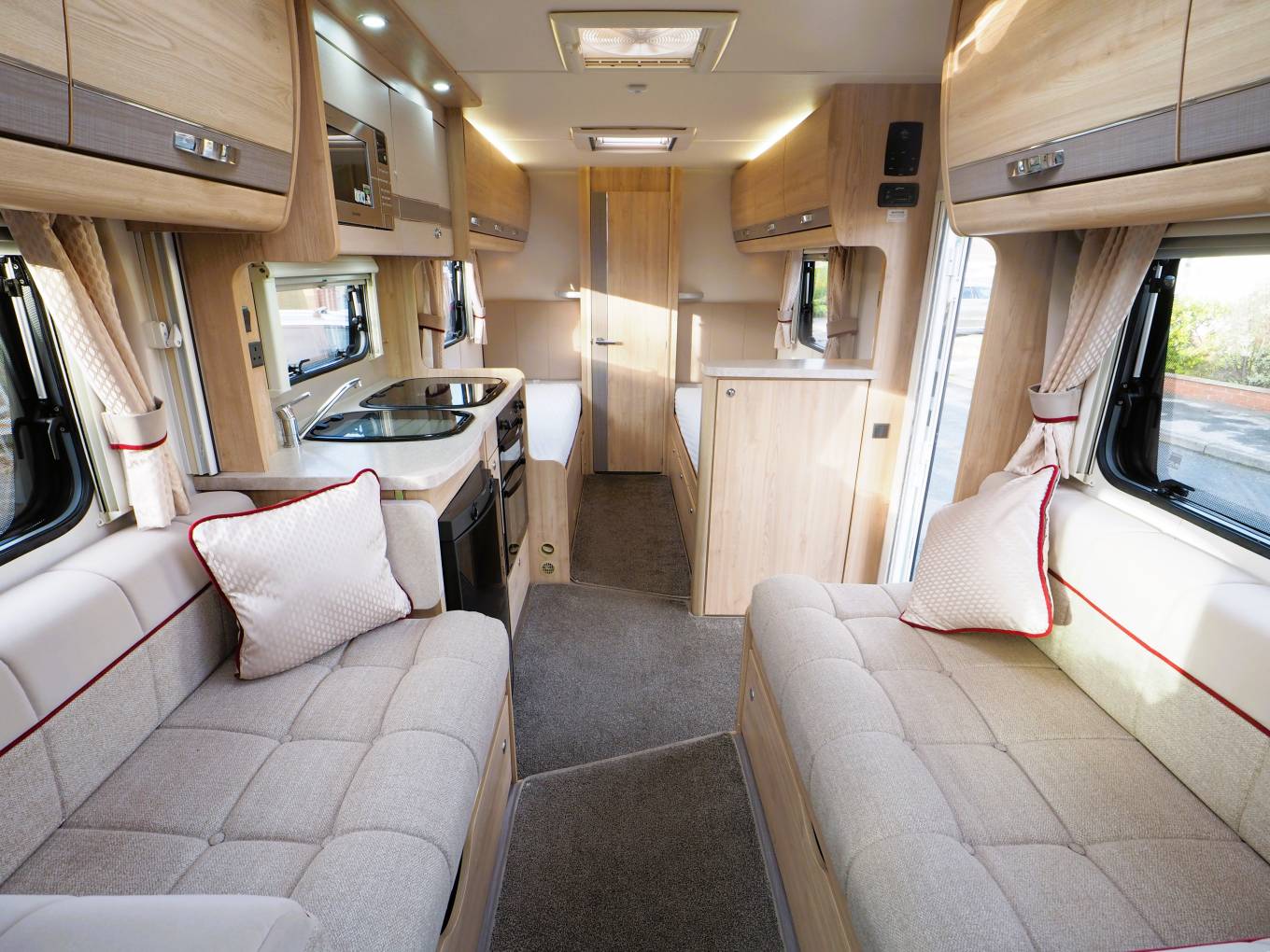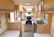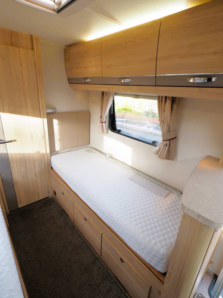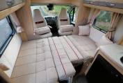 The front lounge with side sofas and swivelling front seats creates a great space to relax, dine and entertain. At night the sofas pull together to create a good sized double bed and there is a concertina privacy screen to separate from the rest of the habitaion area. Plenty of storage with space under the sofas as well as overhead lockers to both sides. To the rear are two fixed single beds with storage drawers to one bed and easily accessible services under the other. To both sides there is overhead locker storage.