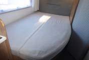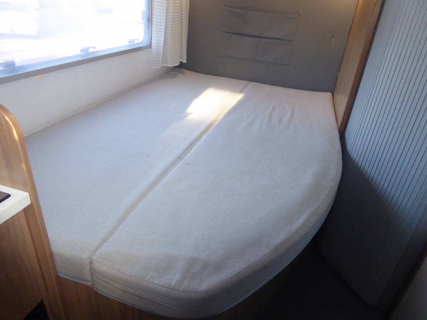 At the rear of the motorhome is an offside double French bed, and a nearside bathroom area with a toilet, a hand basin, and a shower with a tambour screen.