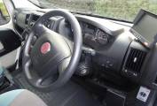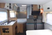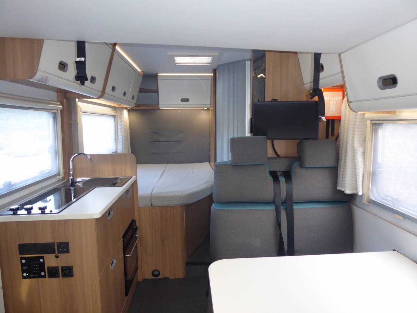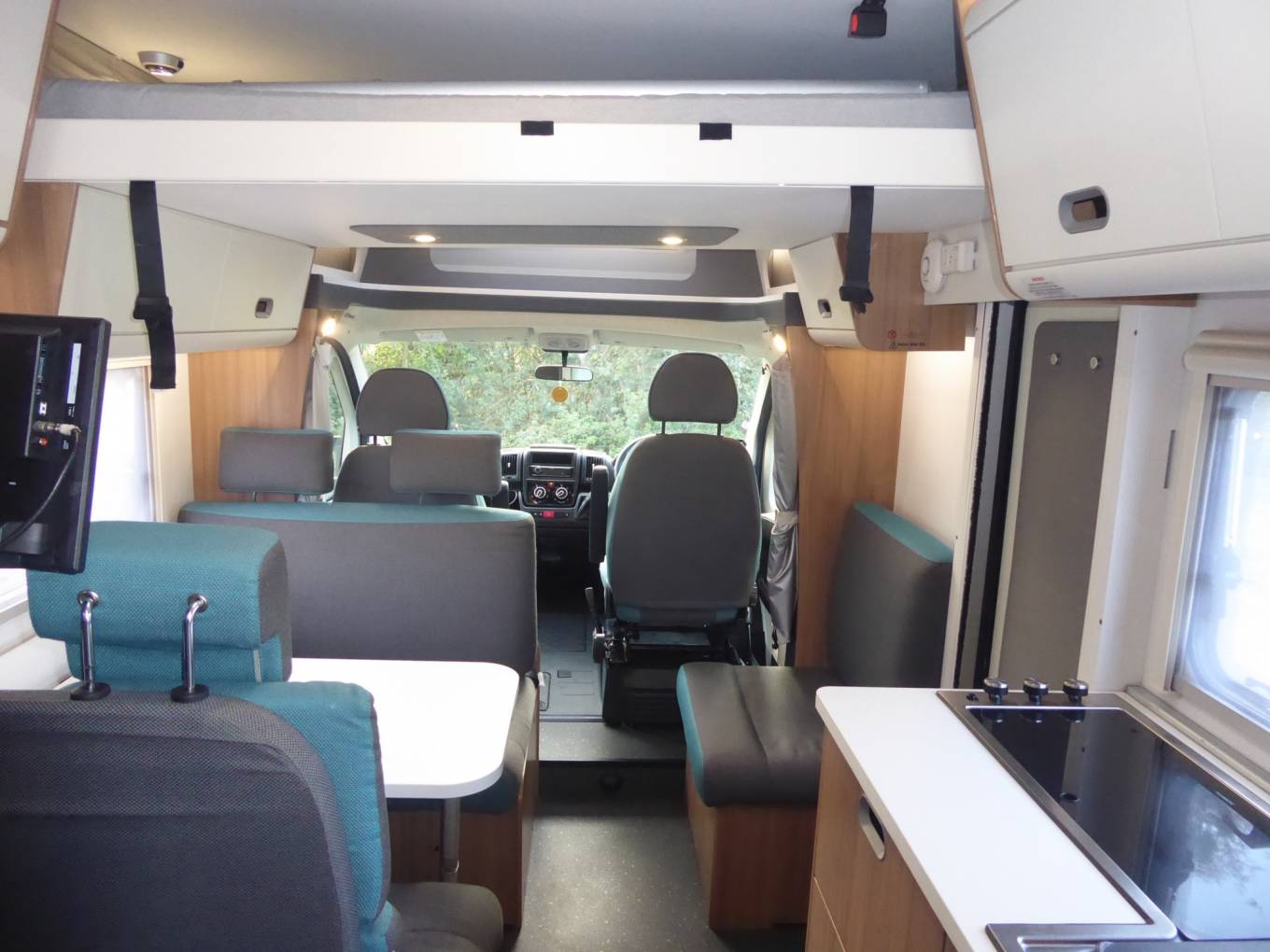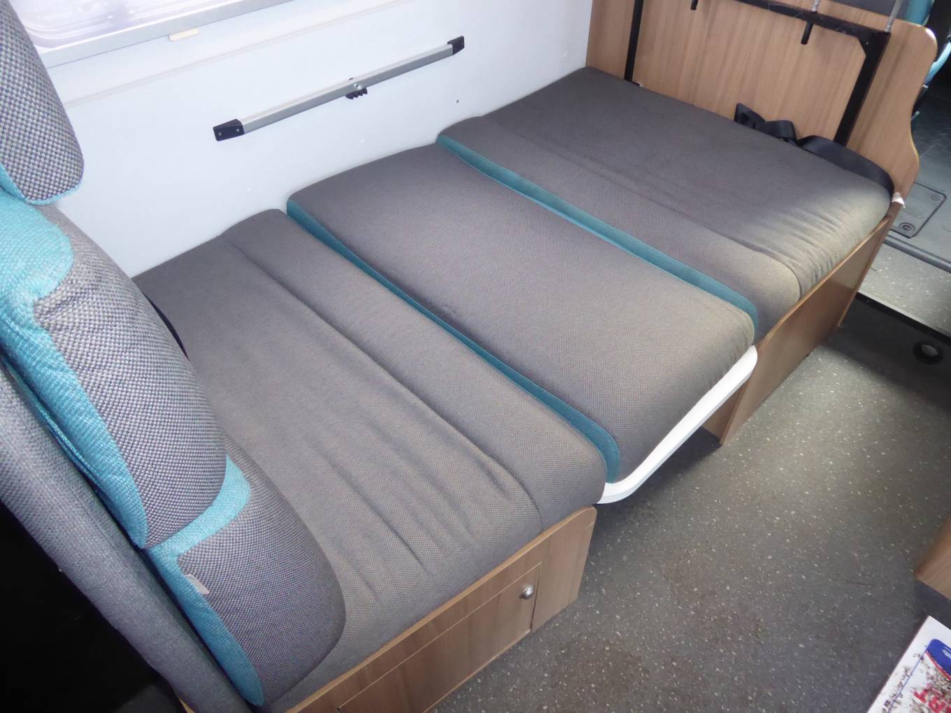 Behind the cab is the dining/leisure area with nearside full dinette (two forward facing 3-point seat belts and two rear facing lap belts), and an opposing single seat. The dinette readily converts to a double berth, and, stored in the ceiling above, there is an electronic drop down transverse double bed.