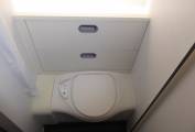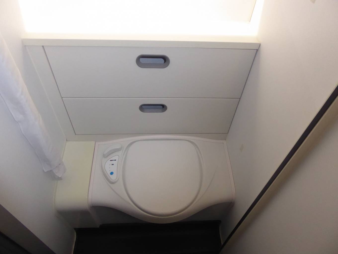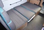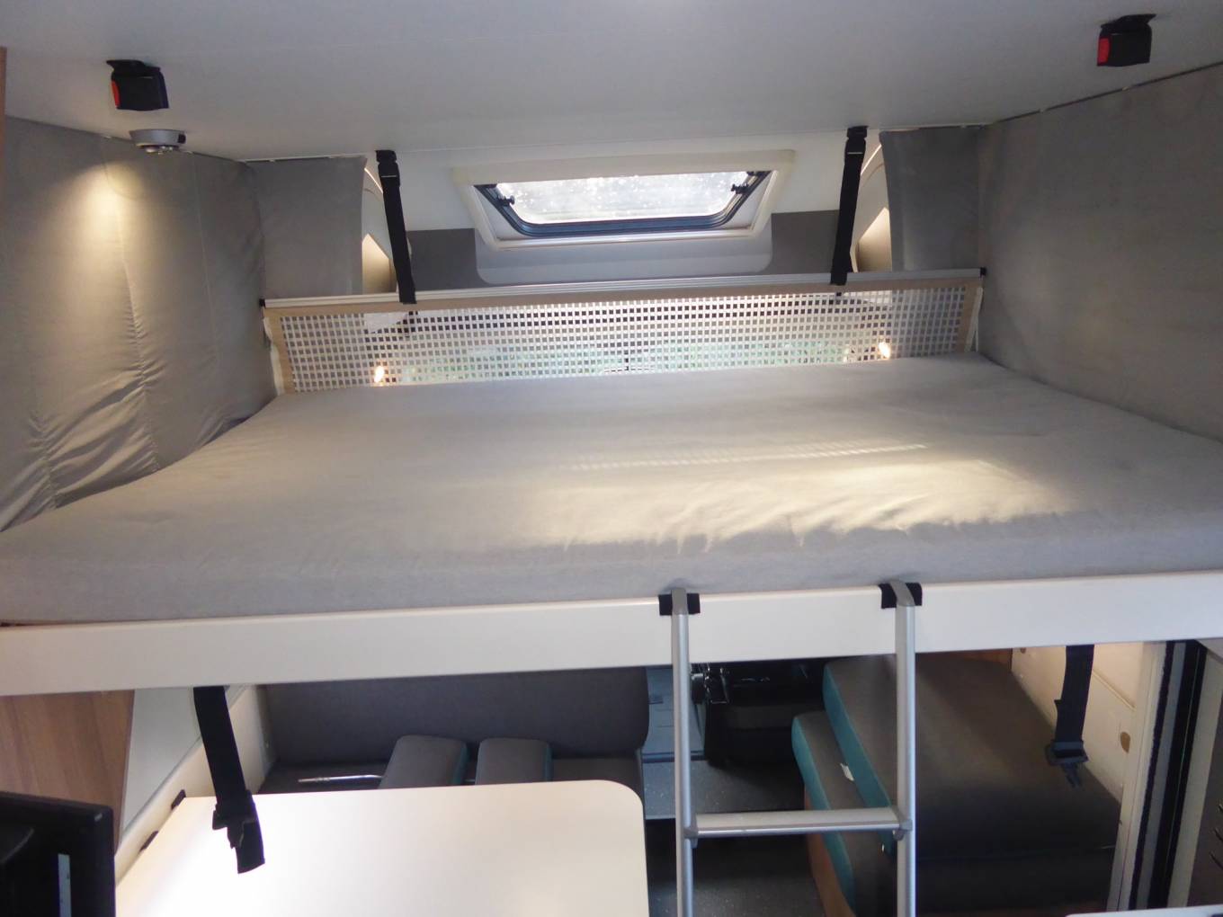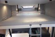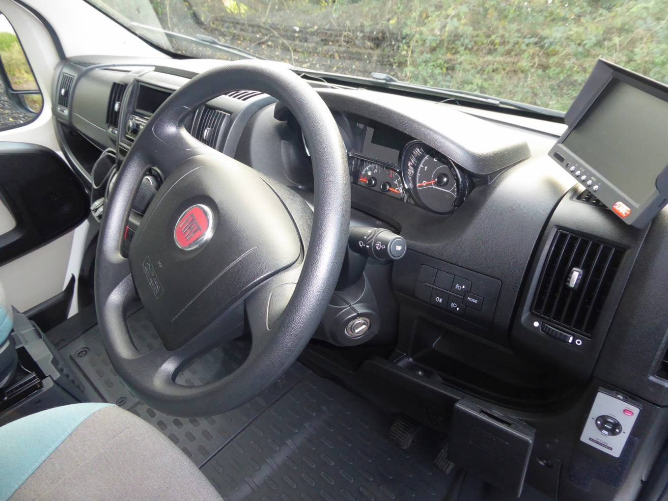 Behind the cab is the dining/leisure area with nearside full dinette (two forward facing 3-point seat belts and two rear facing lap belts), and an opposing single seat. The dinette readily converts to a double berth, and, stored in the ceiling above, there is an electronic drop down transverse double bed.