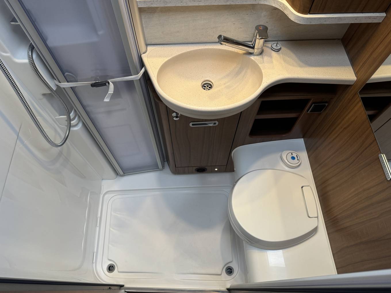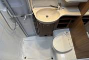 Moving through to the centre of the motorhome, there is a large washroom which includes a shower, wash basin with mixer tap, cupboards and a separate Thetford toilet with further storage units. This area can be closed off from both the bedroom and living area.