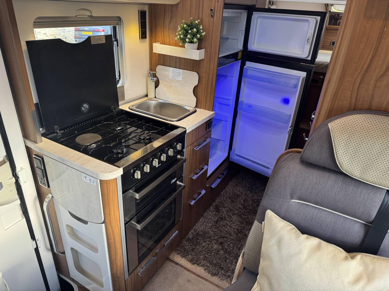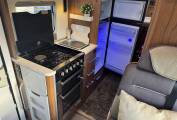 Carrying on through the motorhome, we come to the kitchen area where there is an oven along with a 3 ring gas hob supplied from the refillable Gaslow bottle system located in the external storage unit. Next to the cooker is the sink with mixer tap and last but not least there is a large 3 way Dometic fridge with freezer compartment.