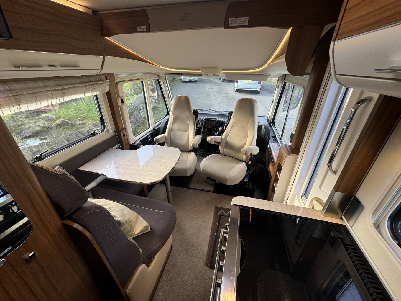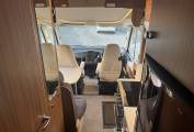 As we head towards the front of the motorhome, we come to the lounge/dining area where there are the rear two travelling seats form part of a L shape sofa along with the driver and passenger seats that both swivel to face the large dining table that is positioned in between which offers that warm family dining experience. Above the cab is the large deop down bed that can easily accommodate two adults.