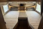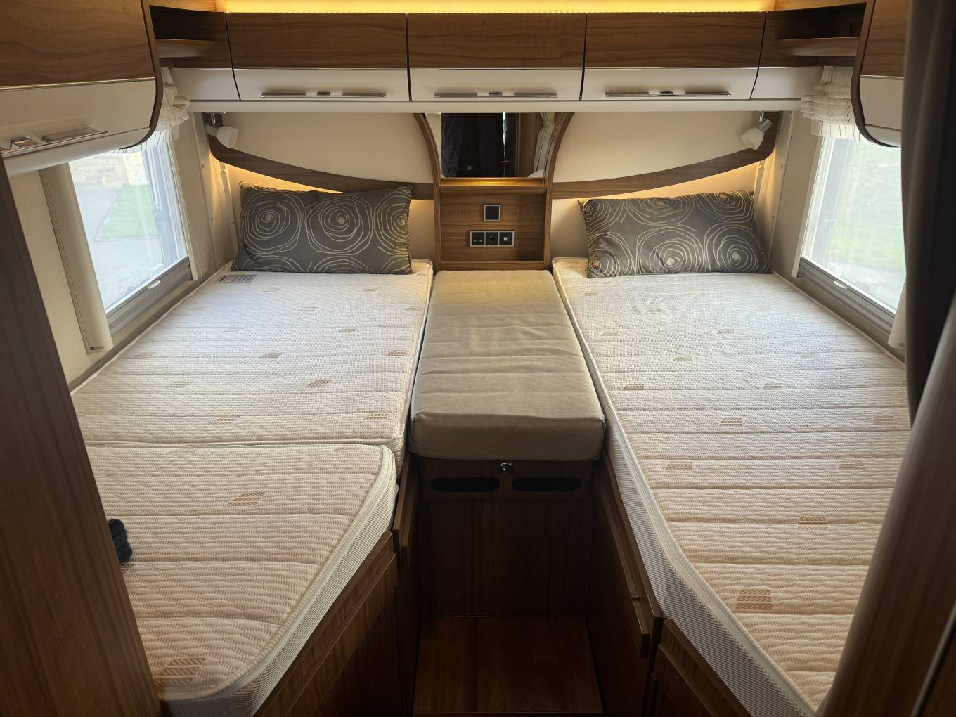 Starting with the rear of the motorhome, you have the extremely large fixed elevated Twin beds which are surrounded by multiple spot lights with plenty of storage space in the overhead cupboards. With the extra bed infill piece, this also makes a very large king size bed. Underneath the bed is the large garage which has plenty of room to store items such as a drive away awning, bicycles, luggage and many other items.
