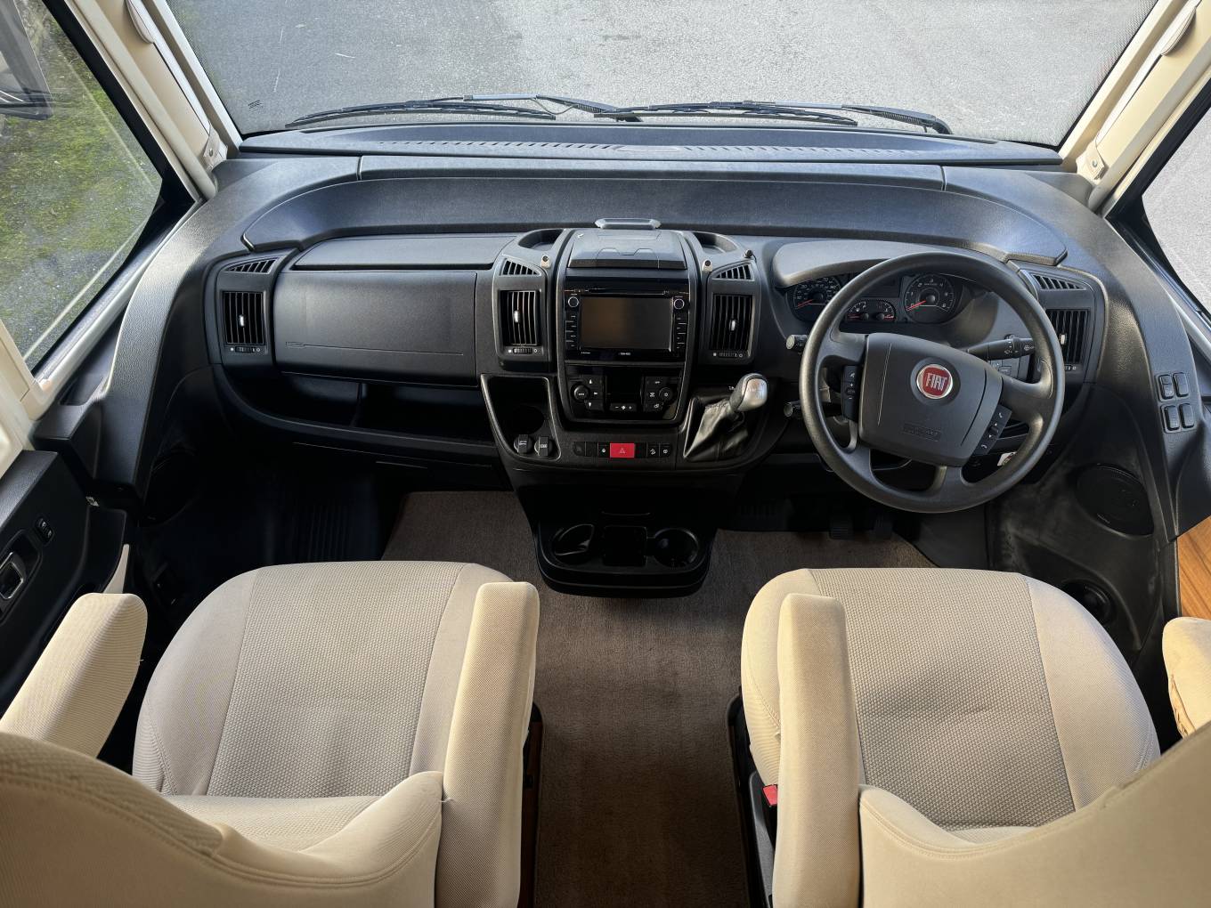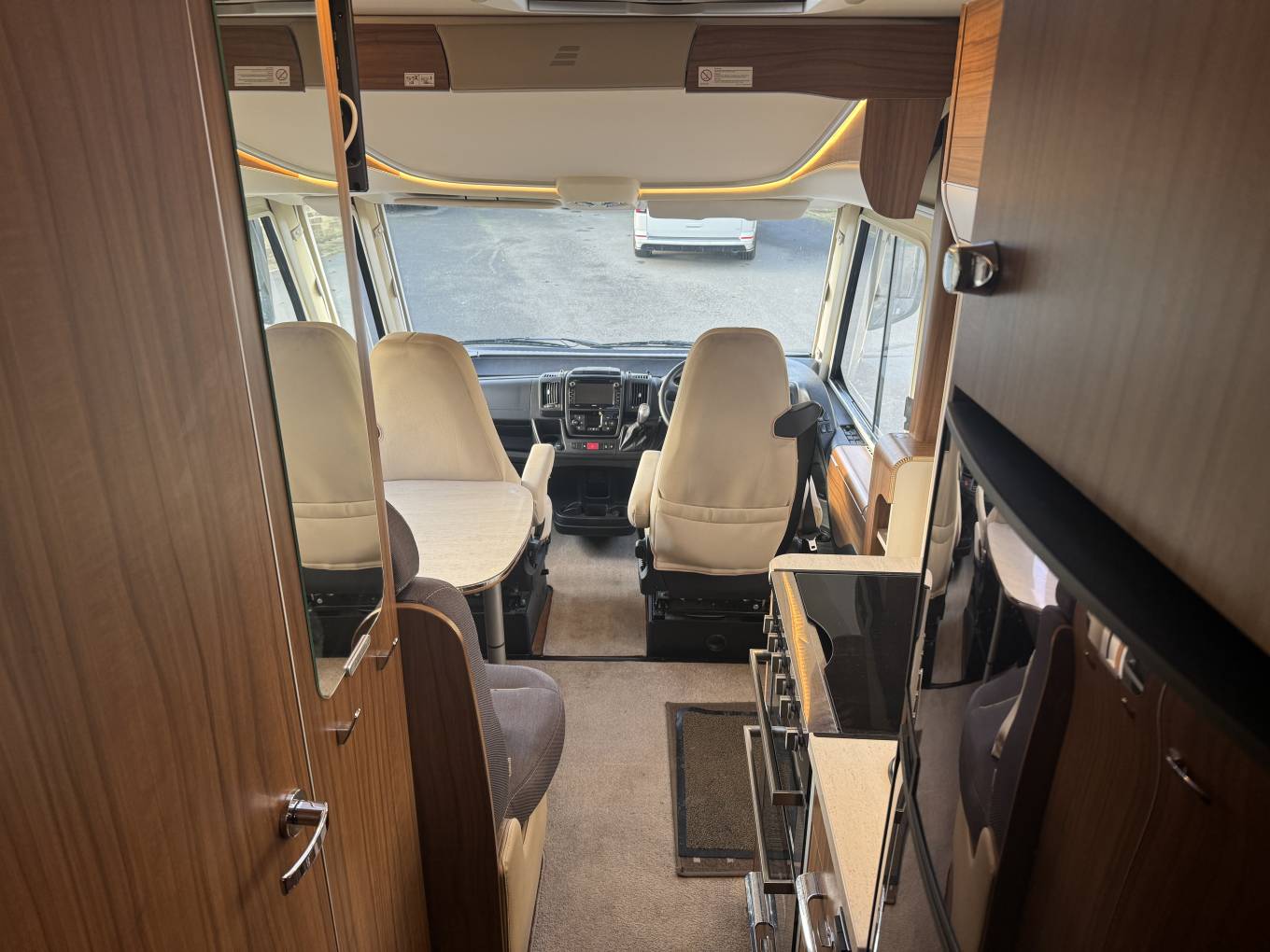 In the cab, the vehicle has an automatic gearbox, a touchscreen interface which includes bluetooth phone, radio, reversing camera and satellite navigation. There is also air conditioning along with electric windows and mirrors. Externally there is a wind out awning to allow al fresco dining, BBQ Point, Shower point along with external storage lockers including the enormous garage.