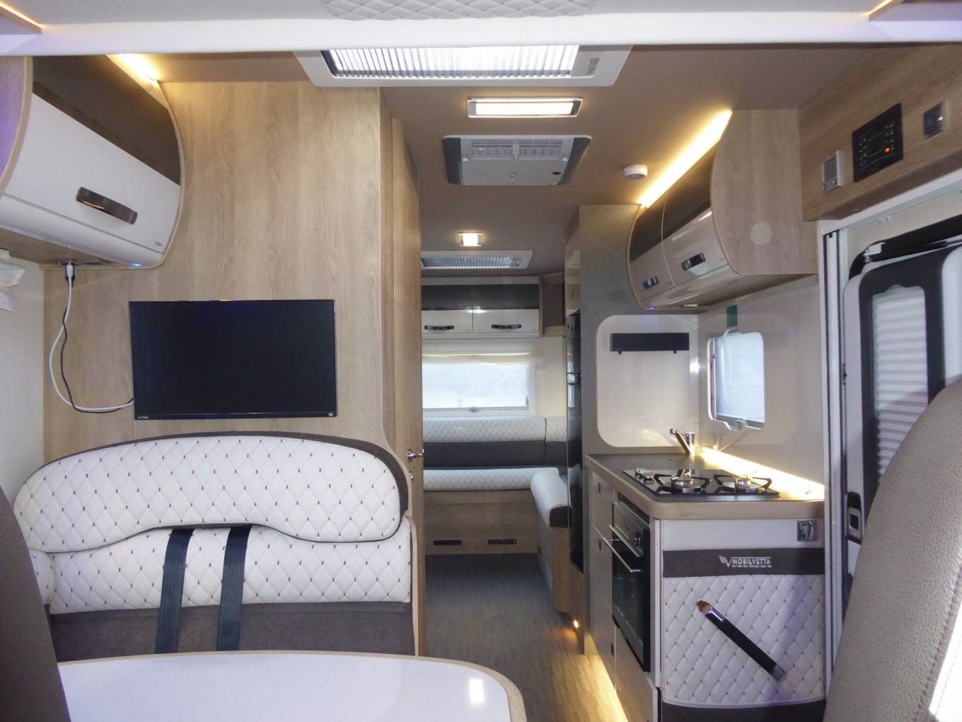 The centre of the vehicle hosts a nearside kitchen area with a hob with 2 gas burners and an electric induction plate, a combination oven/grill, a fridge and separate freezer, and a sink.
