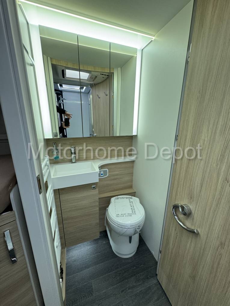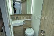 Moving rear again is the bathroom area with a washroom on the passenger side and opposite a large shower cubicle with Perspex doors to close. The toilet door can open right across the gangway to separate the front from rear giving a very private dressing area. The washroom consists of Thetford cassette style toilet with electric fresh water flush & swivel head, above is a white built in sink with chrome mixer tap above. There is a large mirrored cabinet giving a feeling of light & space & a towel radiator to the side.