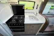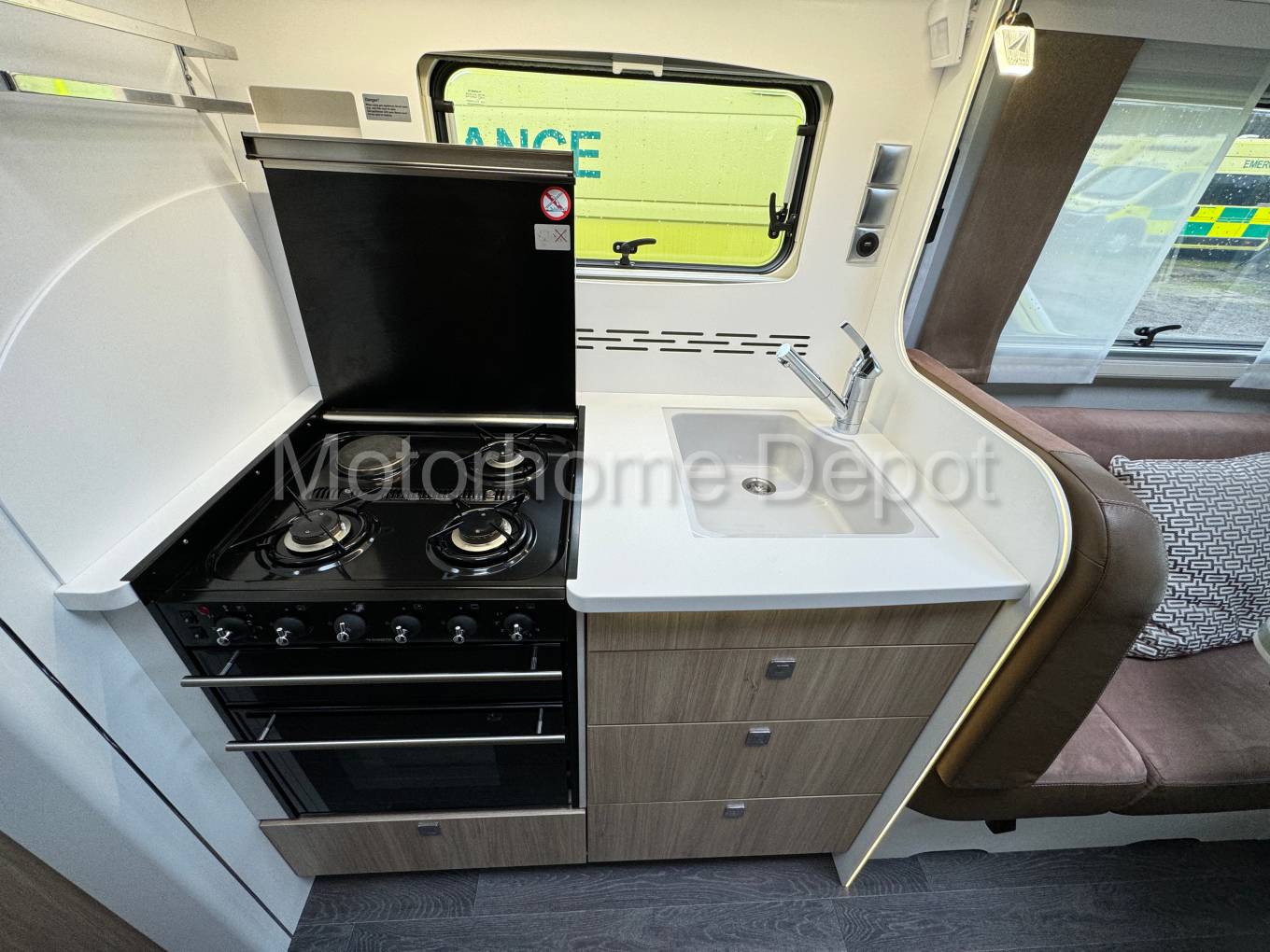 Moving rear is the galley style kitchen which consists of white one piece worktop with sunken white sink & chrome mixer tap above. Full sized oven & grill with a 4 burner hob, 3 gas and 1 x 240 hotplate for use on site. On the opposite side is the large Dometic fridge with separate freezer box doors can be opened both ways. This can be powered by 240v,12v or gas depending whether you are plugged in on site or wild camping. In the above cupboard is a 240v microwave. There is plenty of cupboard and drawer space for all your holiday utensils & provisions.
