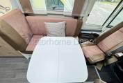 We enter the motorhome on the passenger side via an electric step to the right of the habitation door is the lounge area with two opposing sofas, a 2 seater on the drivers side and a 3 seater opposite. There is a central table with clever extending central leaf so that the table can be smaller size while travelling. The two front seats rotate to join this area so you could easily seat 7 people while entertaining on site. At night the second large double bed electrically drops down from over the cab area and can be accessed by hopping up on the sofa. Two traveling seats on either side can be made up with removable back rests for travelling guests. There is a 32” TV to the left of the habitation door for your evening entertainment.