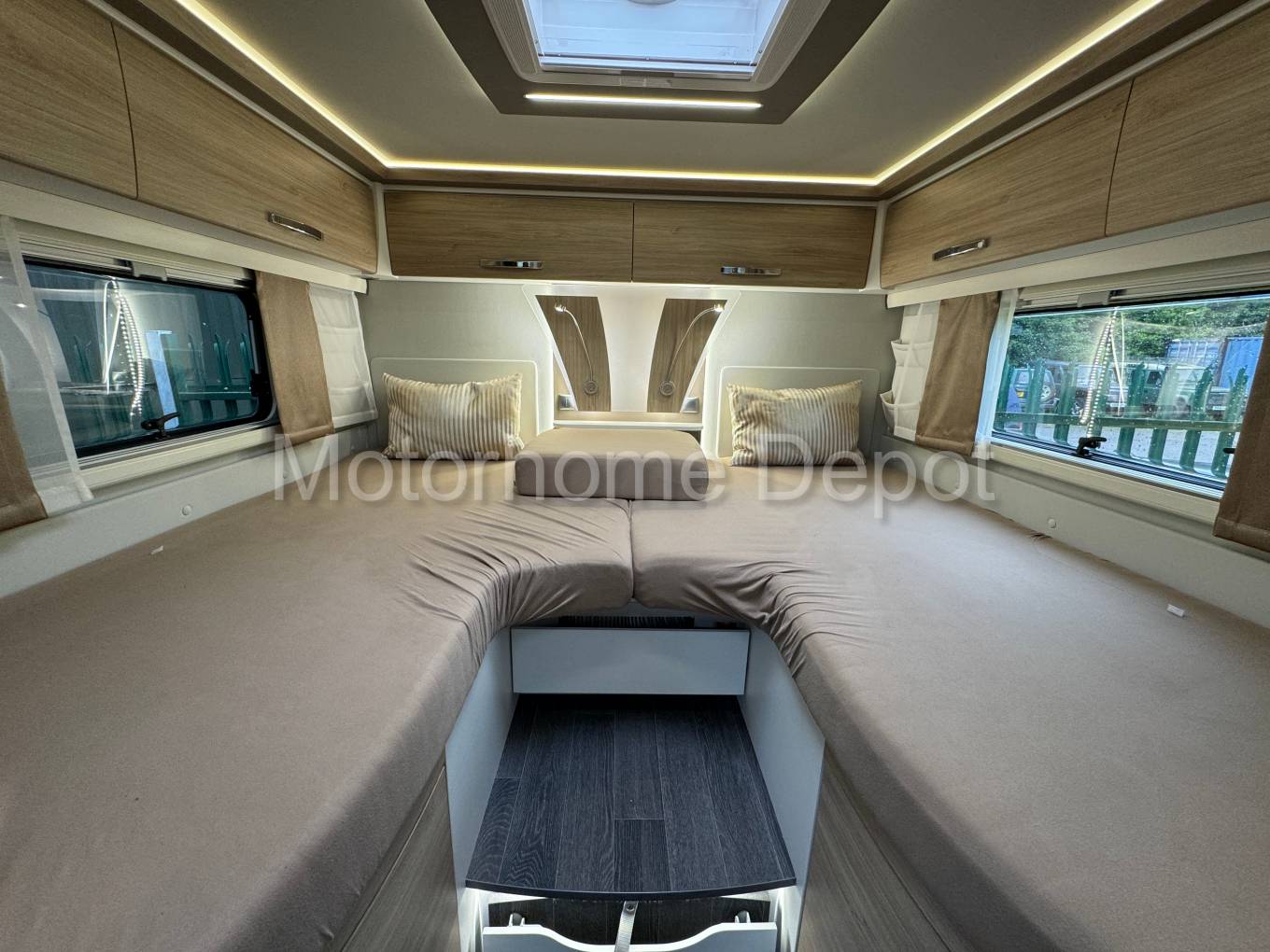 Finally to the rear is the main bedroom which is a twin singles over garage layout. There are built in steps to gain access and an infill cushion to make the bed more like a double. At the foot of the beds are sliding hanging rails either side. There is a TV point with 24” Flatscreen Avtex tv at the foot of the bed.