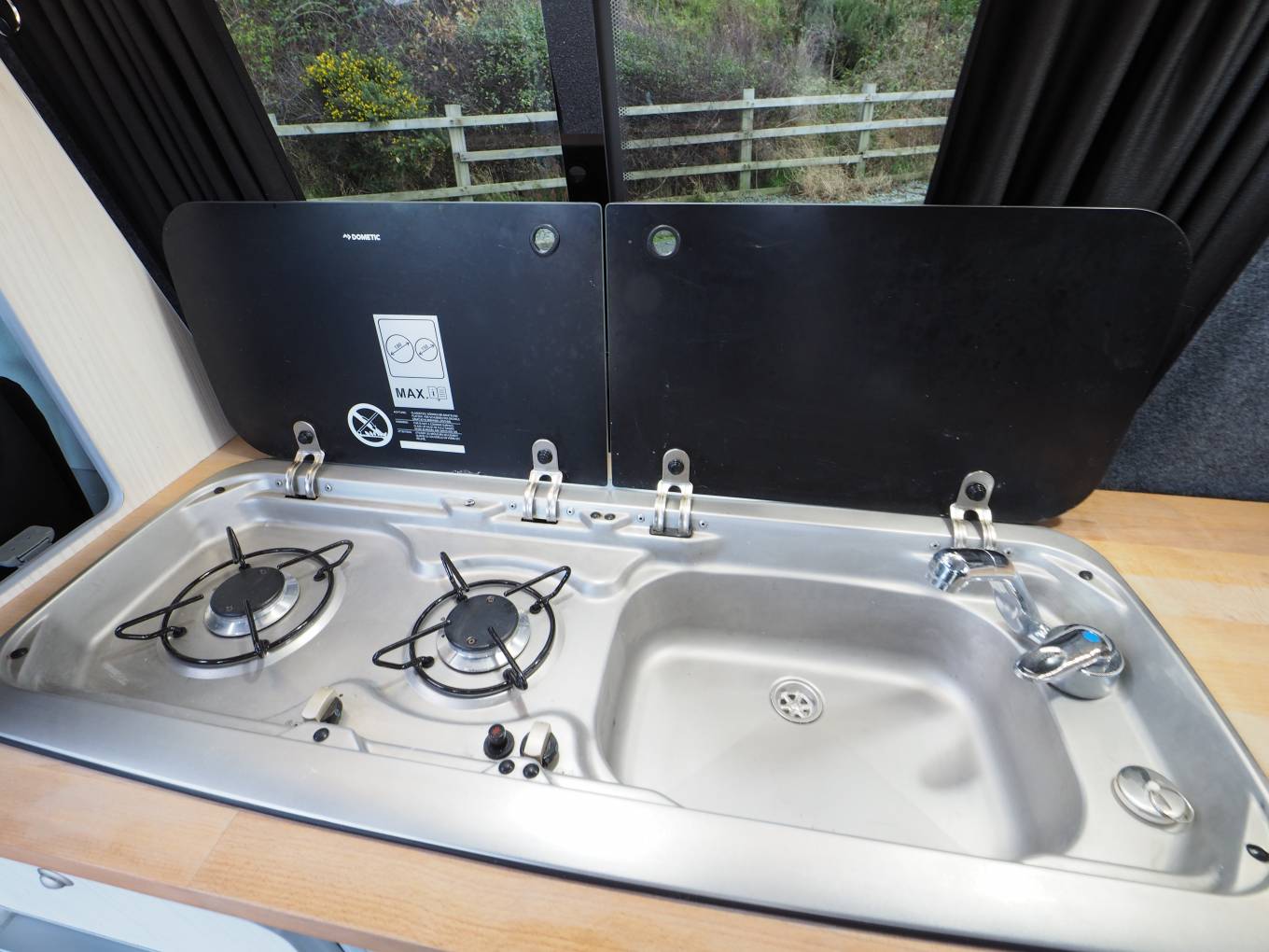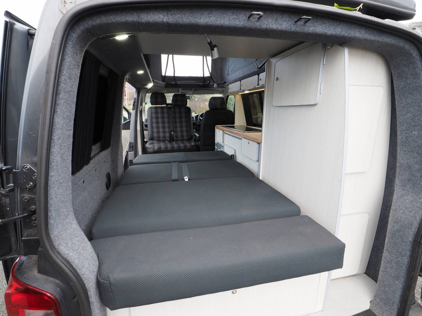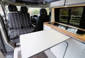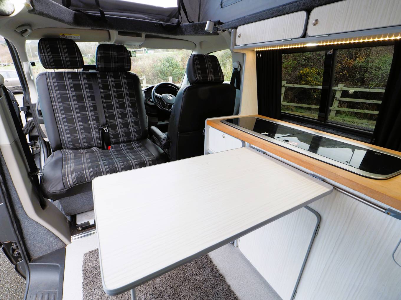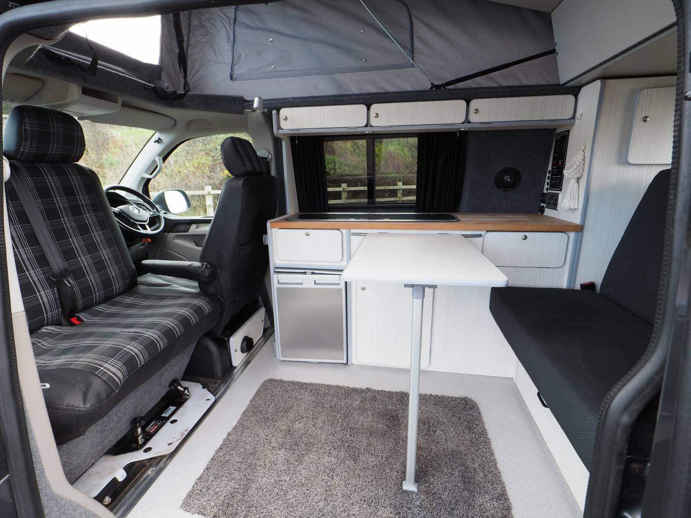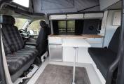 The T6 is fitted with a Rock n Roll bed and has a bed board with mattress to accomodate 4 people. An awning rail adds the possibility of a drive away awning and increases the options to accomodate a 5th berth. A drop-in table and the swivelling front double seats makes for a comfortable place to dine, entertain or even work. A 2 burner gas hob, fridge with freezer box and sink provide kitchen facilities. Power is via 230v electric hook-up or from the 120Ah Lithium battery that gives 12v power for lighting and the fridge. A gas locker stores the on board gas bottle for the hob. Heating is via the Webasto diesel heater.