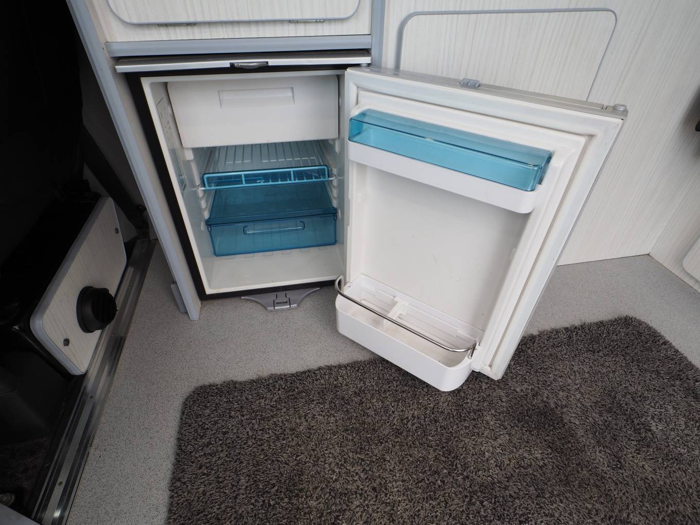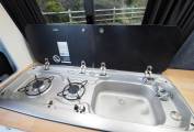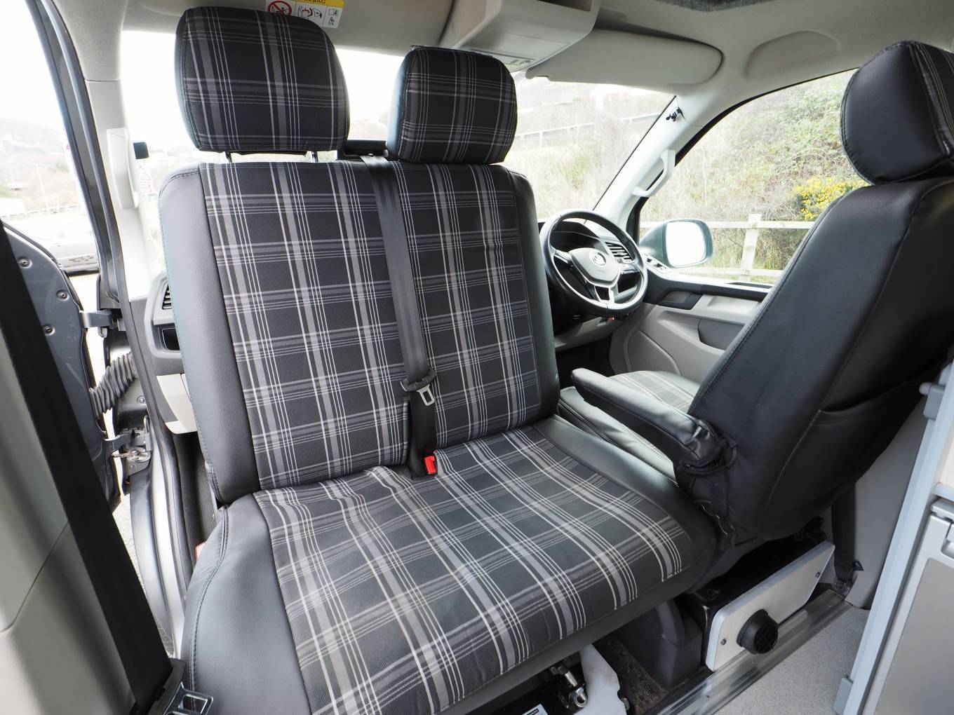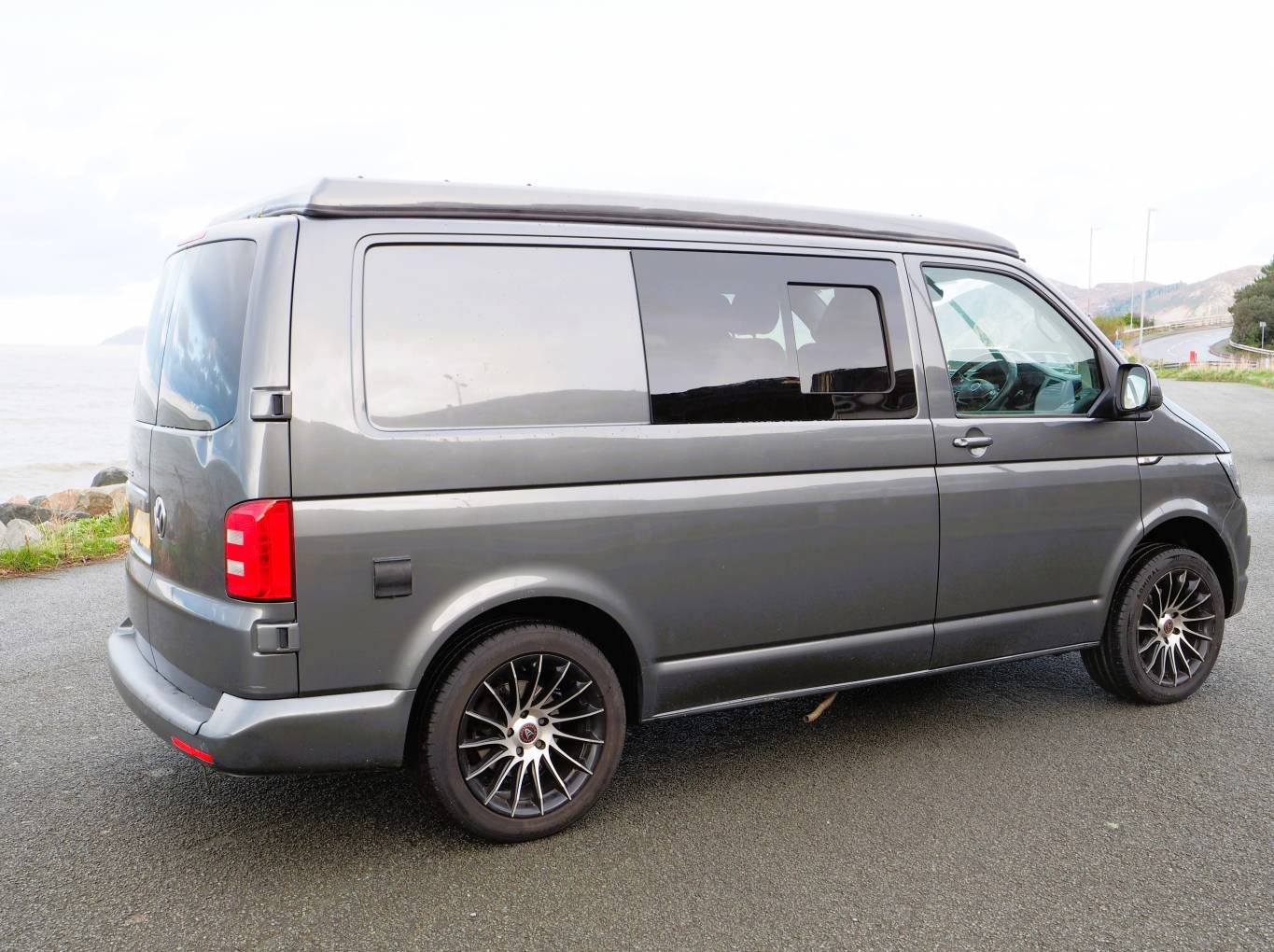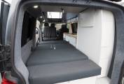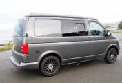The T6 is fitted with a Rock n Roll bed and has a bed board with mattress to accomodate 4 people. An awning rail adds the possibility of a drive away awning and increases the options to accomodate a 5th berth. A drop-in table and the swivelling front double seats makes for a comfortable place to dine, entertain or even work. A 2 burner gas hob, fridge with freezer box and sink provide kitchen facilities. Power is via 230v electric hook-up or from the 120Ah Lithium battery that gives 12v power for lighting and the fridge. A gas locker stores the on board gas bottle for the hob. Heating is via the Webasto diesel heater.