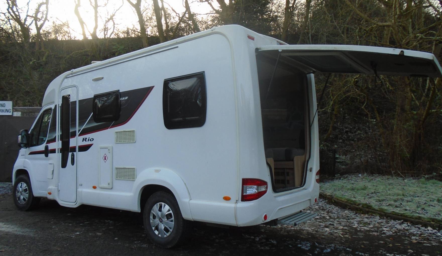 Starting at the rear one of the most striking features of the Rio 340 is the rear opening door which once opened up gives you excellent access into the van through the rear, and gives a great feeling of al-fresco dining when opened towards your chosen vista at mealtimes. Also at the rear is an electric drop down double bed which comes down from the ceiling over the rear dinette at the touch of a button, as and when required.