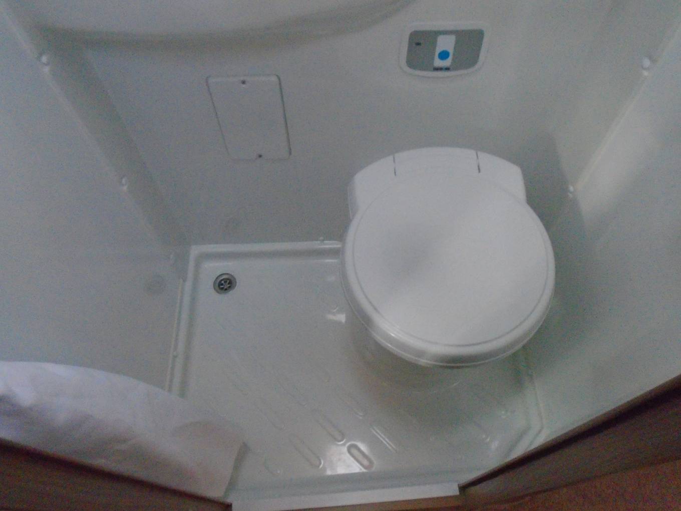 On the opposite wall is the washroom with a swivel style cassette toilet, vanity hand wash basin, shower rail and mirror.