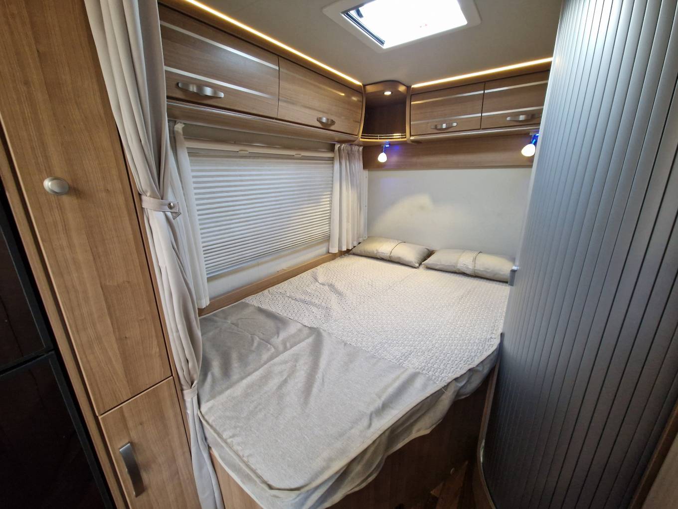 dividing curtain and into the en-suite bedroom featuring a corner ‘French’ Bed