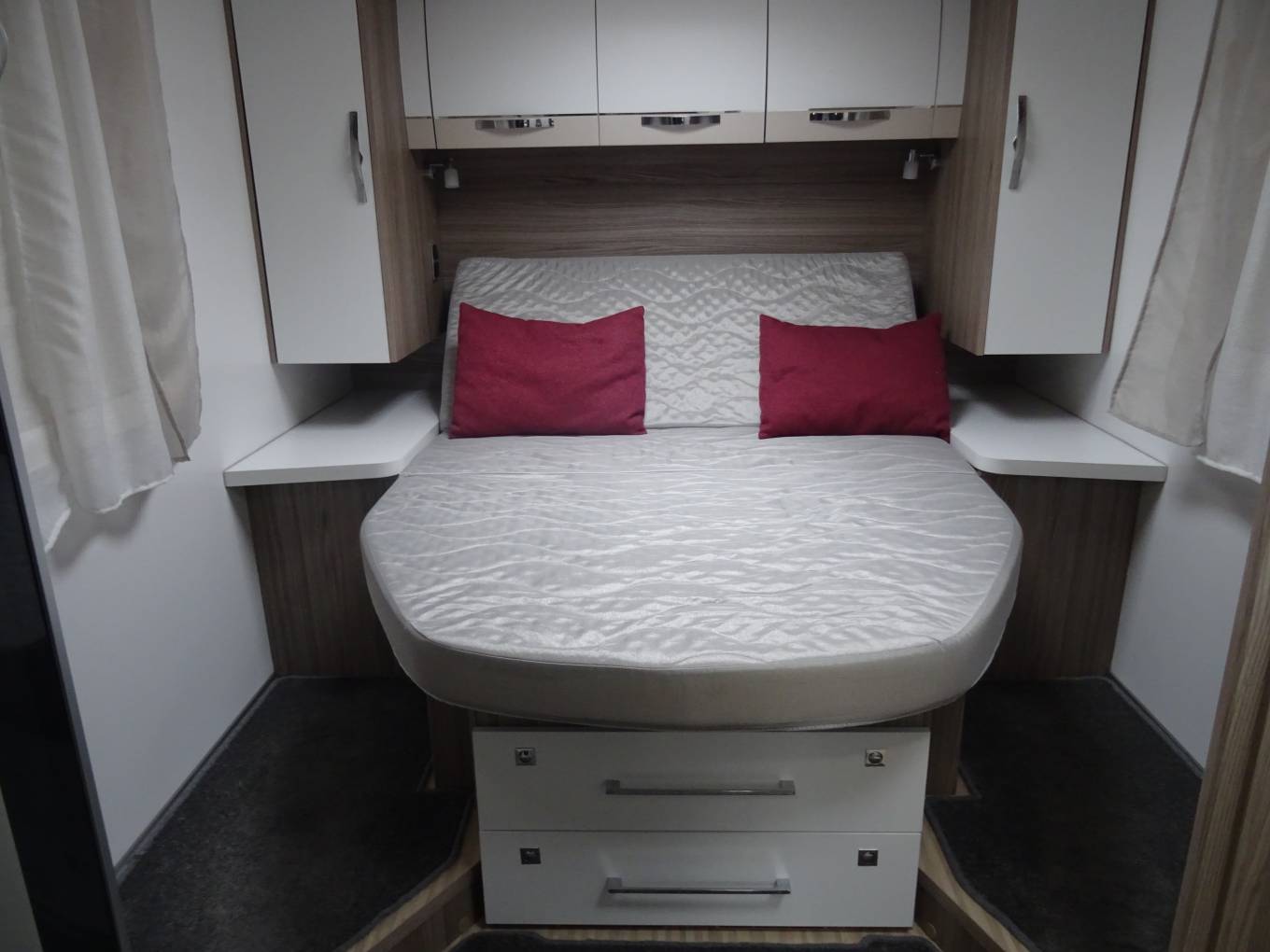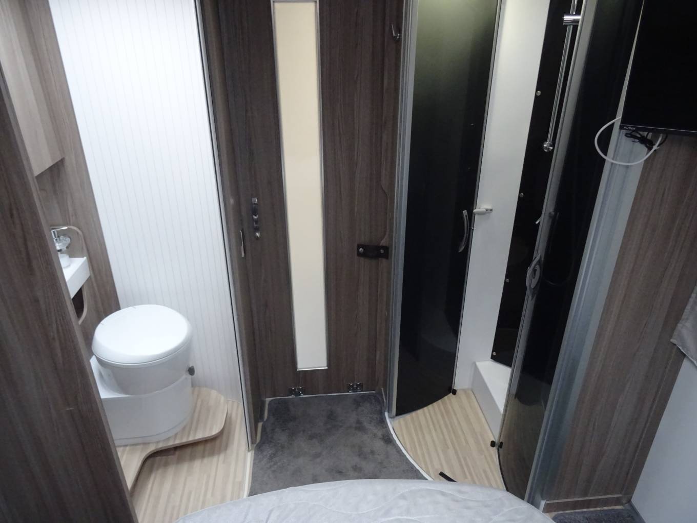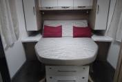 The rear Island bed over a large garage is a main feature as is the electric drop down over lounge bed. The rear bed pushes back for more bedroom space and a recline setting. The shower and toilet are separate, spacious and en-suite and there is a slide door to separate this rear section off. There is also an air conditioning unit in this area.