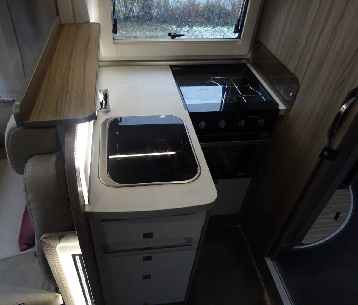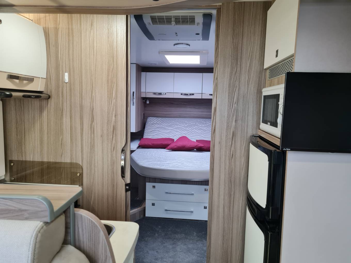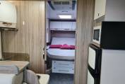 Next up is the high spec kitchen area, offering good storage with soft close drawers. There is a 2 gas 1 electric plate hob, full gas oven/grill (unused) with extractor hood, sink, 80 litre 3 way fridge freezer, microwave (unused) and over head 2 way fan. There is also a small work top extension piece.