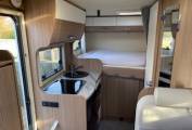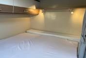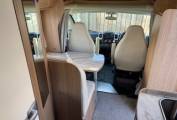 The front dinette has room for 4 people around a large table with the swivel seats and the forward facing bench seats holds the other 2 full seatbelts. Opposite the table is a large wardrobe with hanging rail and above is a tambour style cupboard for more storage. Gas and electric heating is provided by a Truma system. The rear bed with it's own reading lights covers the full width of the motorhome and the front half can be raised to access more hanging and storage space in the garage below.