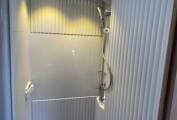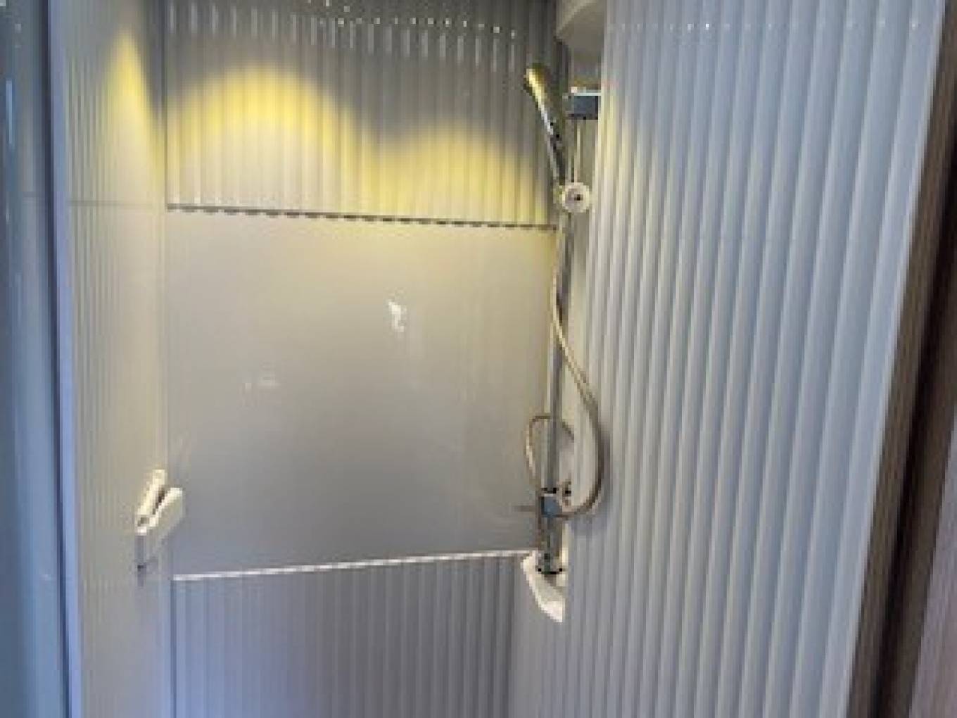 The vehicle has a very imaginatively designed washroom with Thetford cassette w.c. vanity unit and washbasin with a large mirror above. The mirror and basin wall swivels to reveal a full height shower with it's own mixer taps.