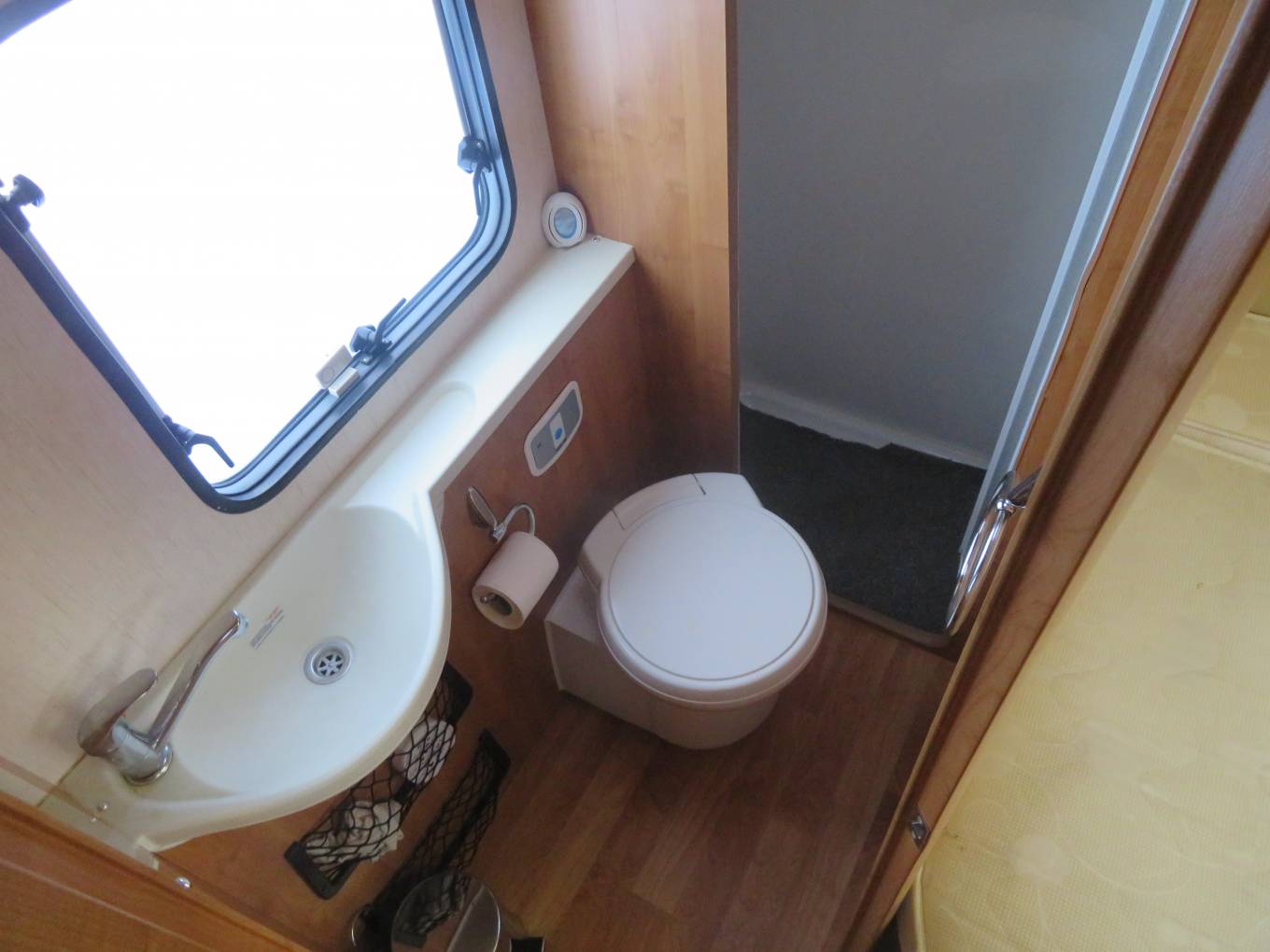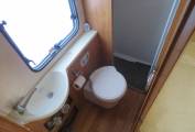 The rear of this lovely motorhome has a large fixed French bed and a substantial washroom with separate shower, toilet and vanity unit.