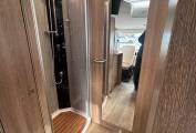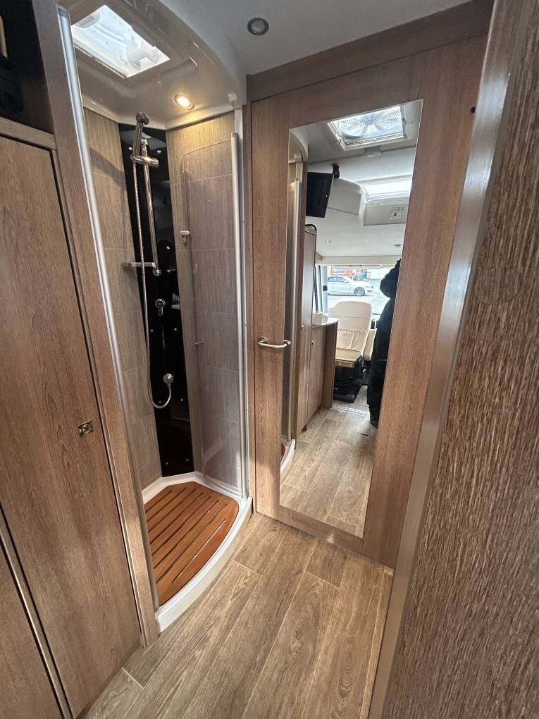 The well-appointed washroom has a cassette toilet, sink with mixer tap, a large mirror, vanity unit, and ample storage. Across the hall, a separate shower cubicle adds to your privacy, with a door to section off this area for an exclusive suite-like experience.