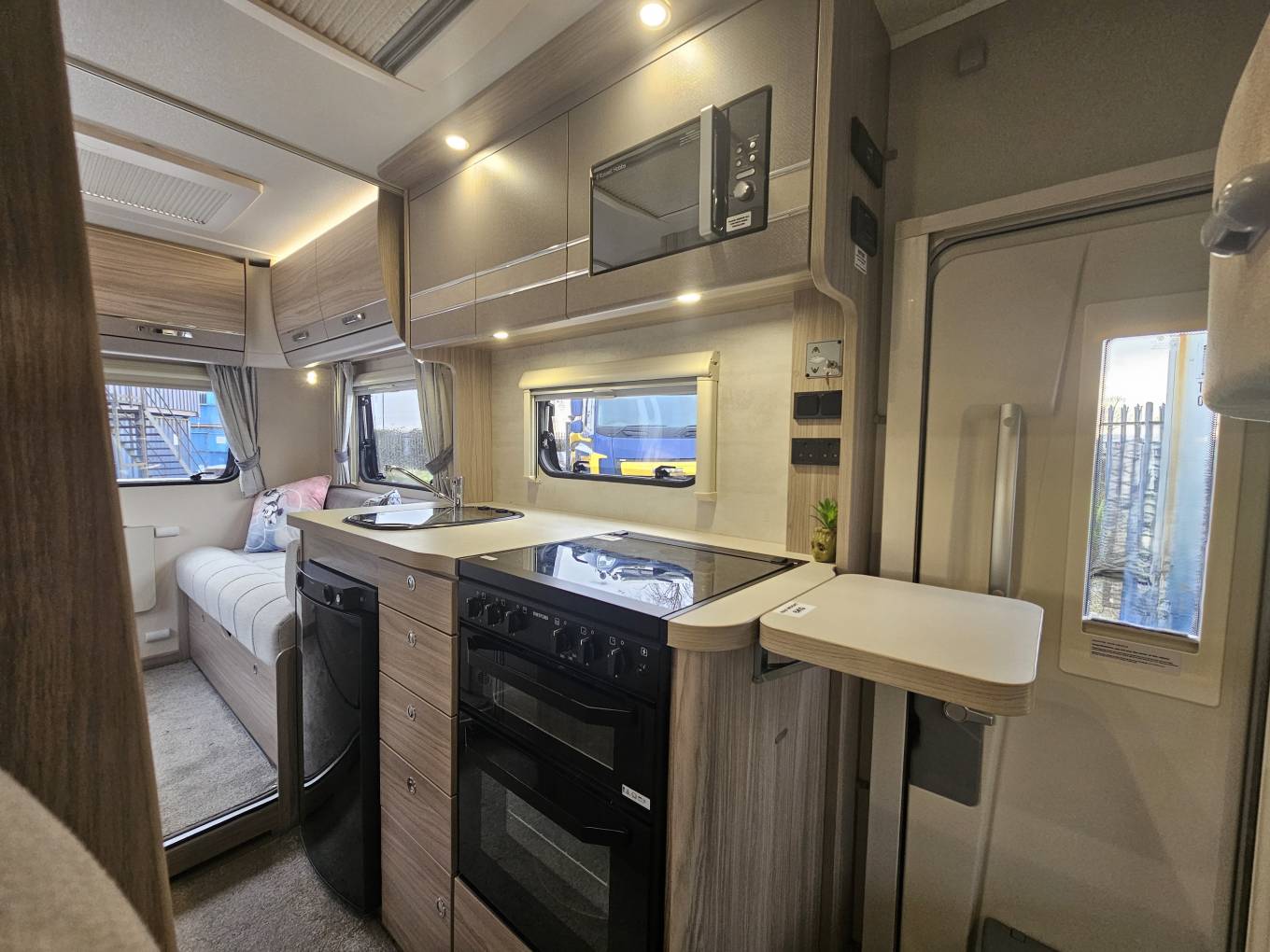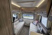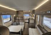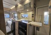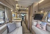 Inside, the Autoquest 196 is designed to accommodate up to six people with six seatbelts, making it an ideal choice for families or groups of friends. The layout includes a central dinette and a spacious rear lounge that transforms into a comfortable sleeping area. Additional sleeping arrangements are provided by an electric drop down double bed. The interior is equipped with all the essentials, including a fully fitted kitchen with an oven, microwave, fridge, 3 x gas hob and 1 x electric plate hob, sink and mixer tap with extra adjustable prep are. The washroom features a toilet, sink and shower, bringing the comforts of home on the road.