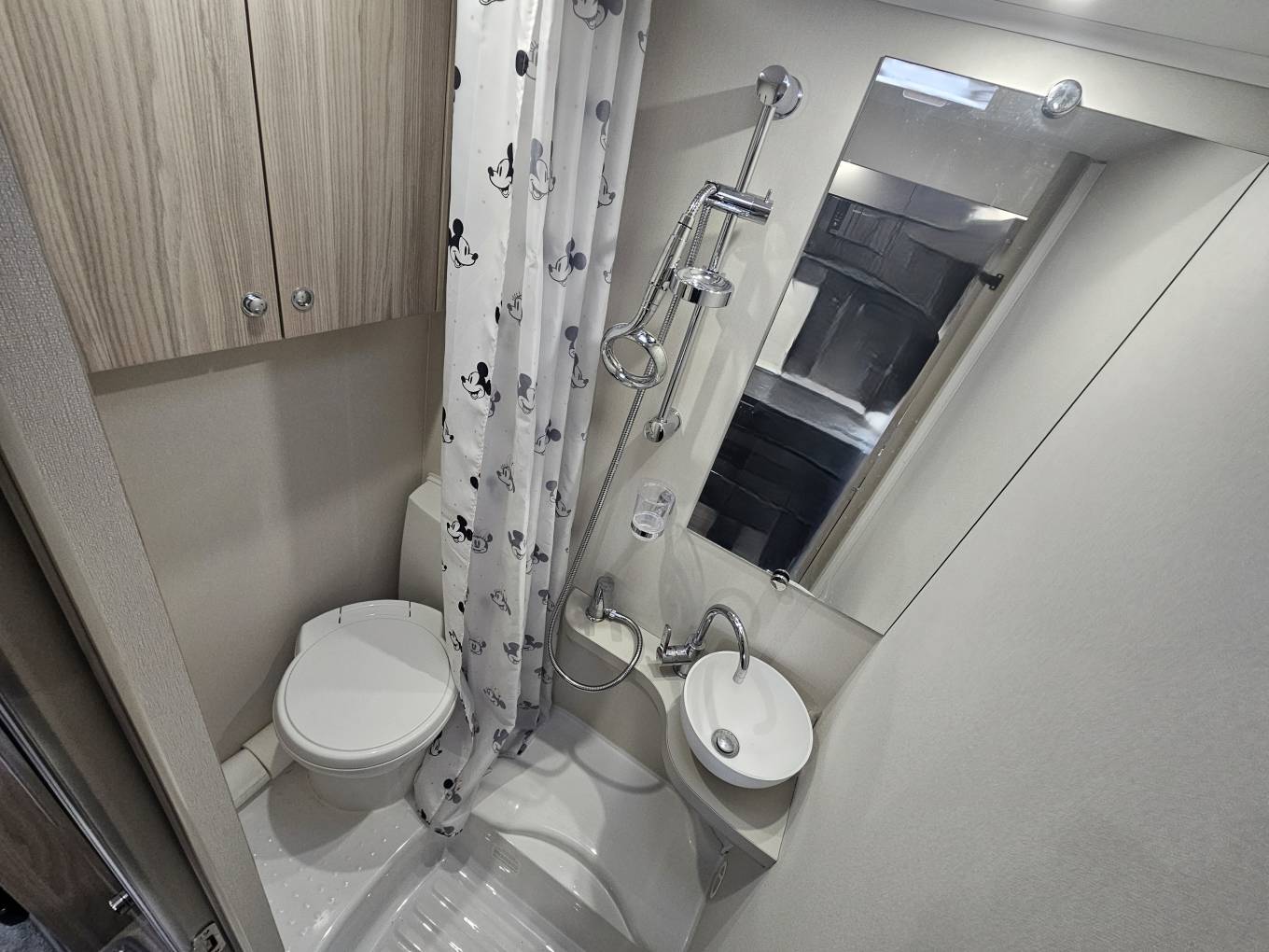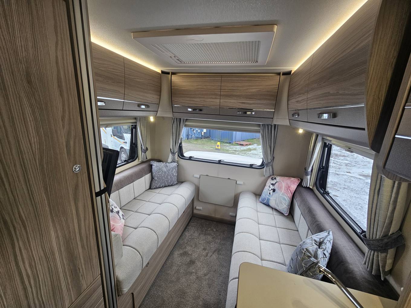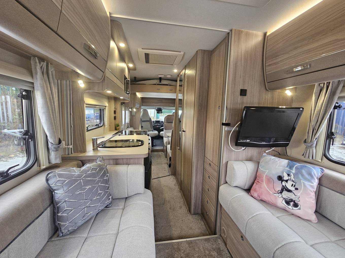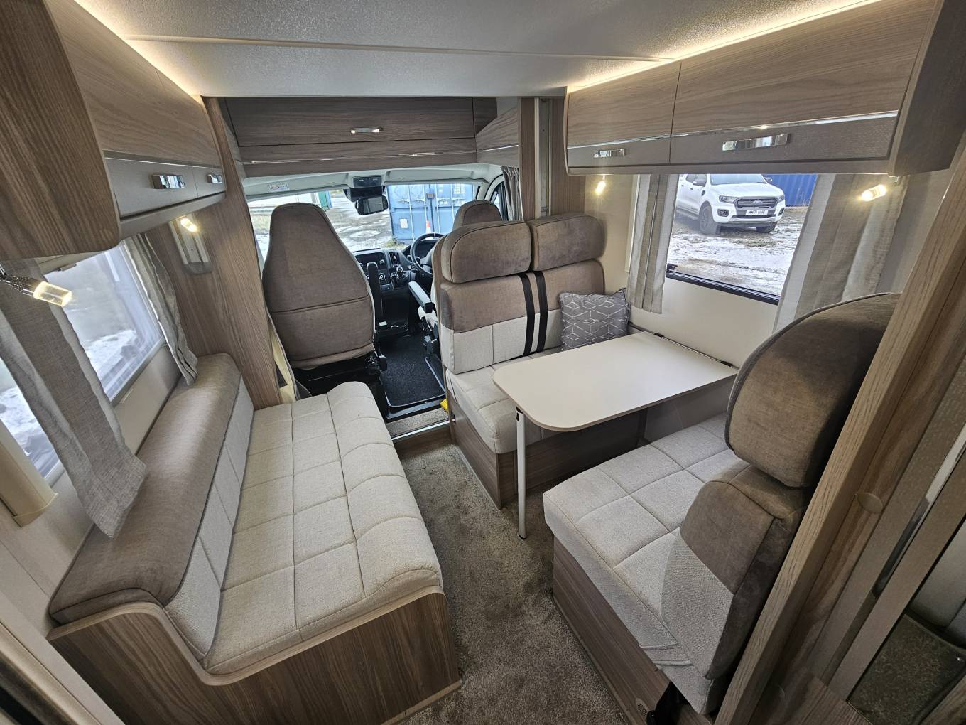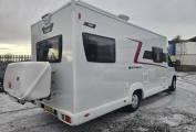 Includes cab air conditioning, Truma blown air heating, and 2 swivel seats for added comfort and better socialising environments. Entertainment is taken care of with a radio and built in aerial and speakers placed around the front and rear of the motorhome, while LED lighting throughout creates a cosy atmosphere. The motorhome is also fitted with a solar panel and an inverter, providing reliable off grid power, and an external gas point and shower point with hot and cold water for added convenience during outdoor stays.