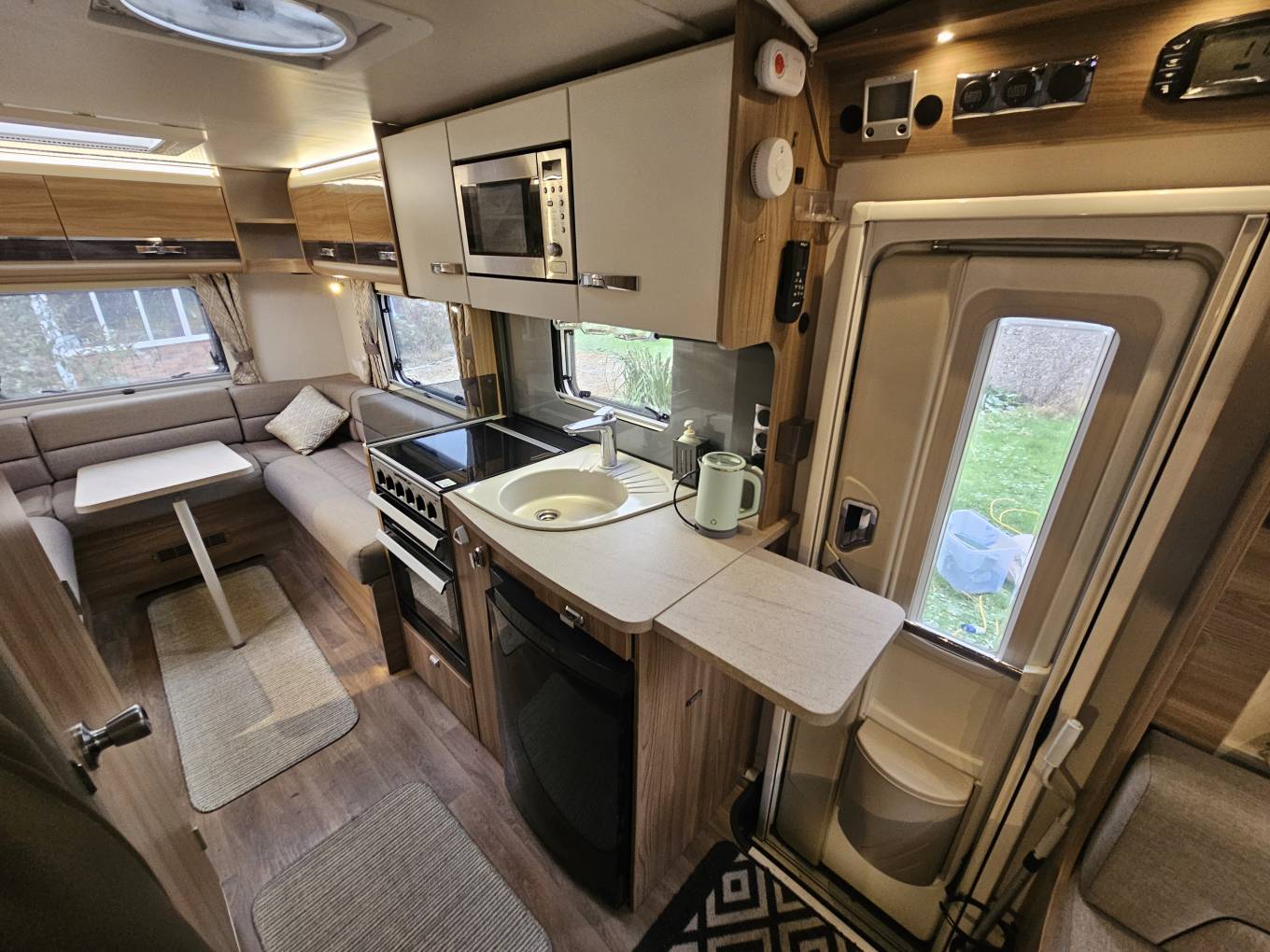 It also comes with Alde heating and a roof-mounted solar panel for off-grid use. A reversing camera is fitted to make parking easier, and it also includes an awning, swivel cab seats, a built-in radio system and a 400 litre CRUZ roof box. There’s plenty of internal and external storage, as well as an external gas point and outside shower connection.