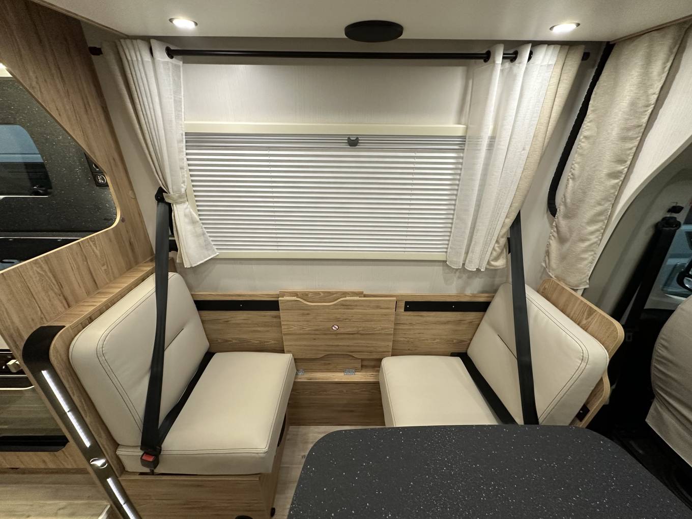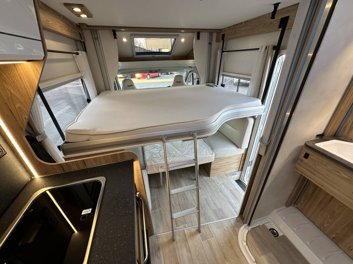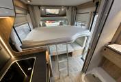 Under the side facing seat there are two folding seats with traveling seat belts, these are conveniently hidden away when they are not being used. Above this area you have a large electric drop down double bed that drops to knee height so no climbing onto the bed.