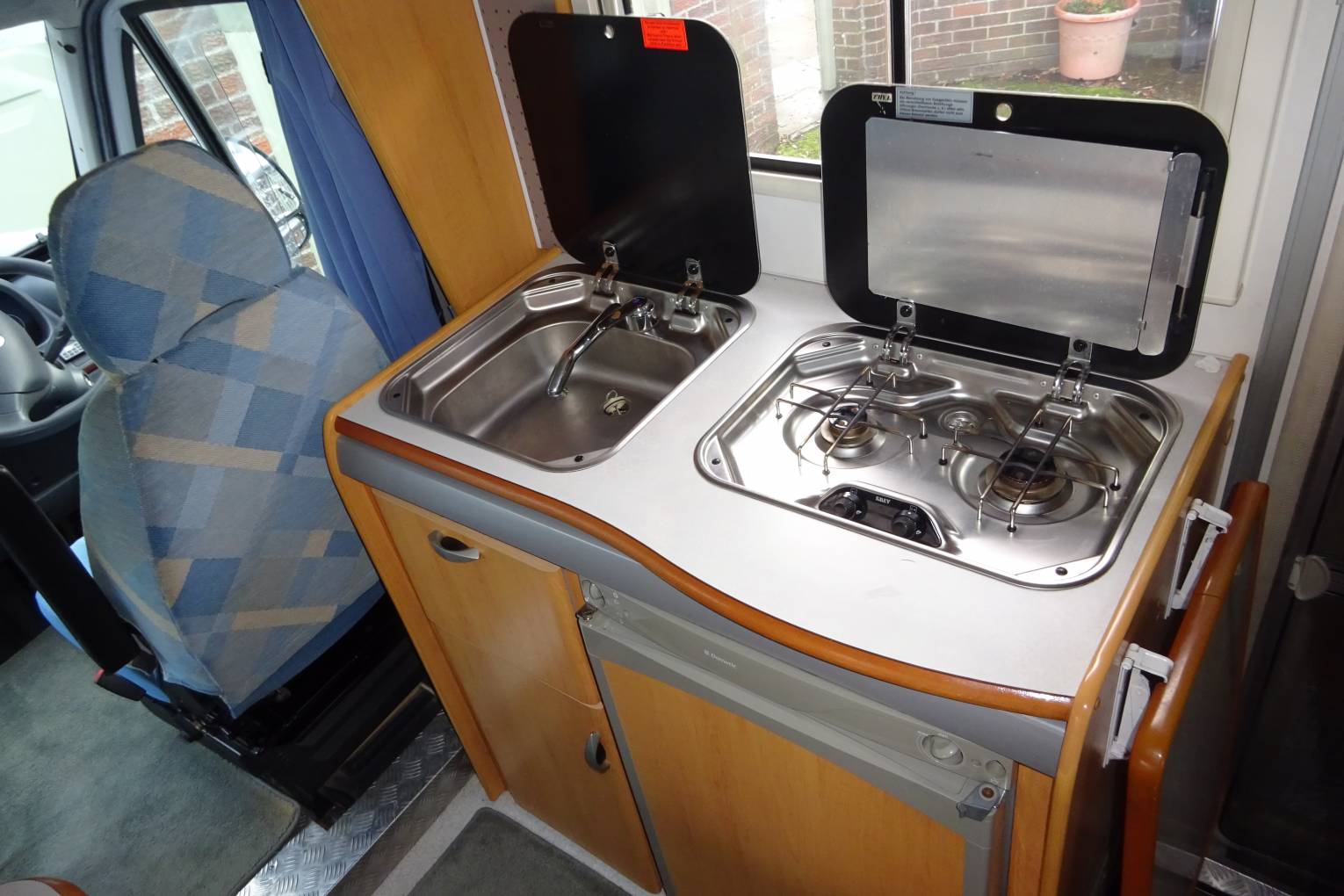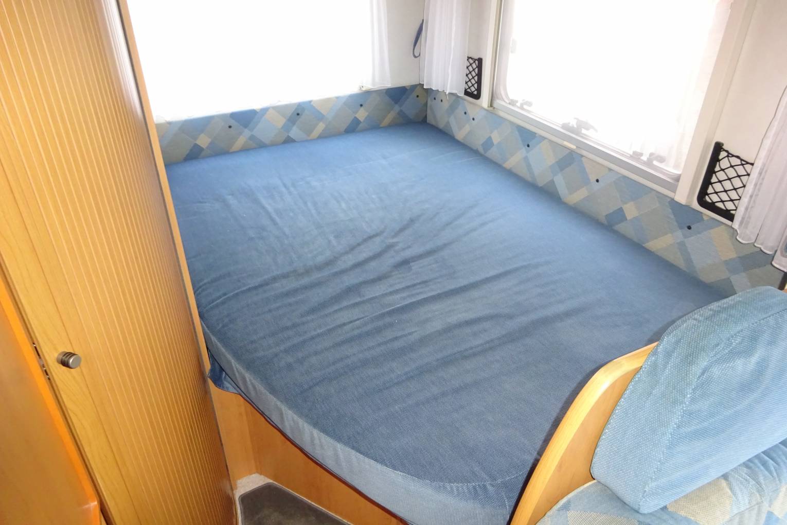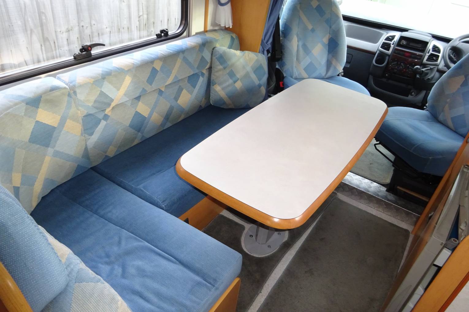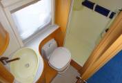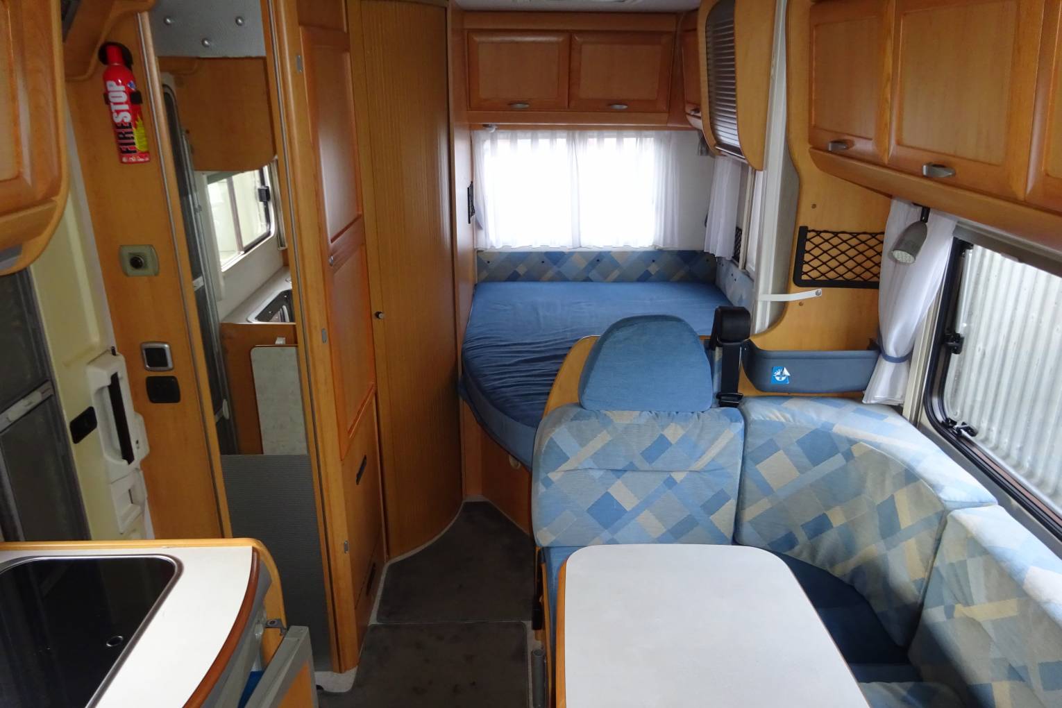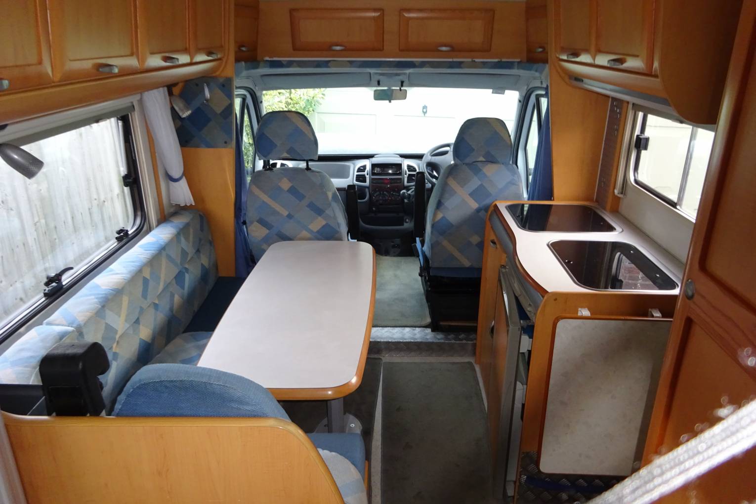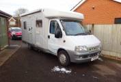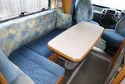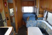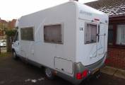 As you step inside the motorhome you get a real feel for the condition of the Motorhome with a light, warm, comfortable feel. The two captains chairs and settees making for a comfortable living area to sit around the table. The well equipped kitchen with a 2 burner gas hob, sink, and large fridge with an ice box allows for all your cooking needs. At the rear of the motorhome is a French bed, and a nice sized bathroom with a shower, sink and toilet. The second double bed is made up from the sitting area. There is ample storage throughout the living area, kitchen and bathroom for all your needs including a large wardrobe and under bed storage accessible from the outside.