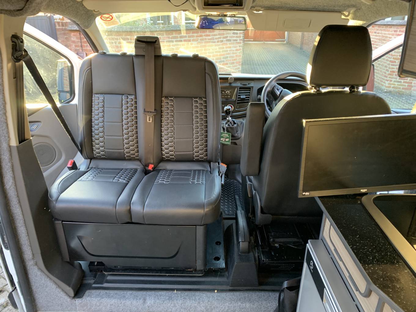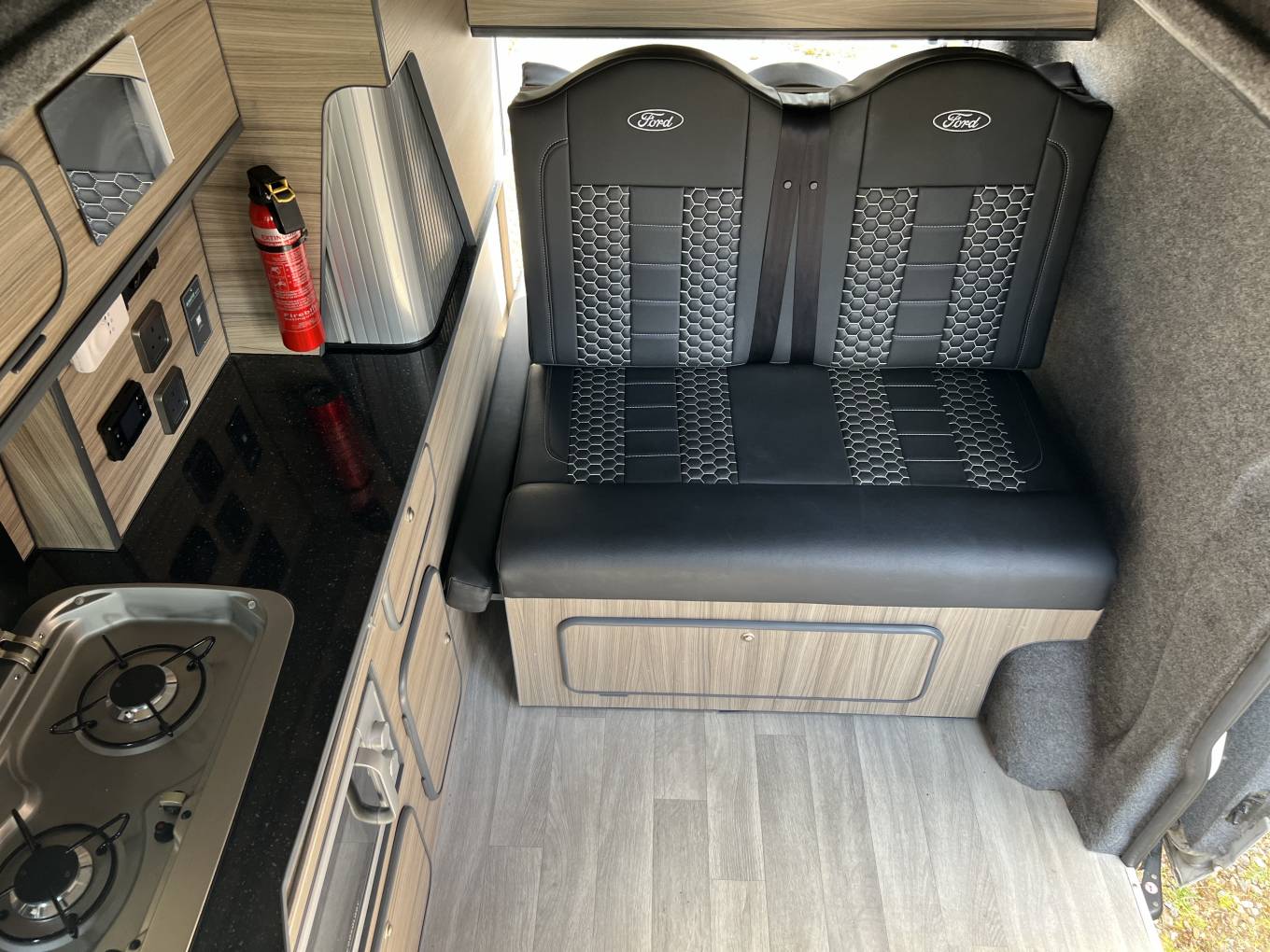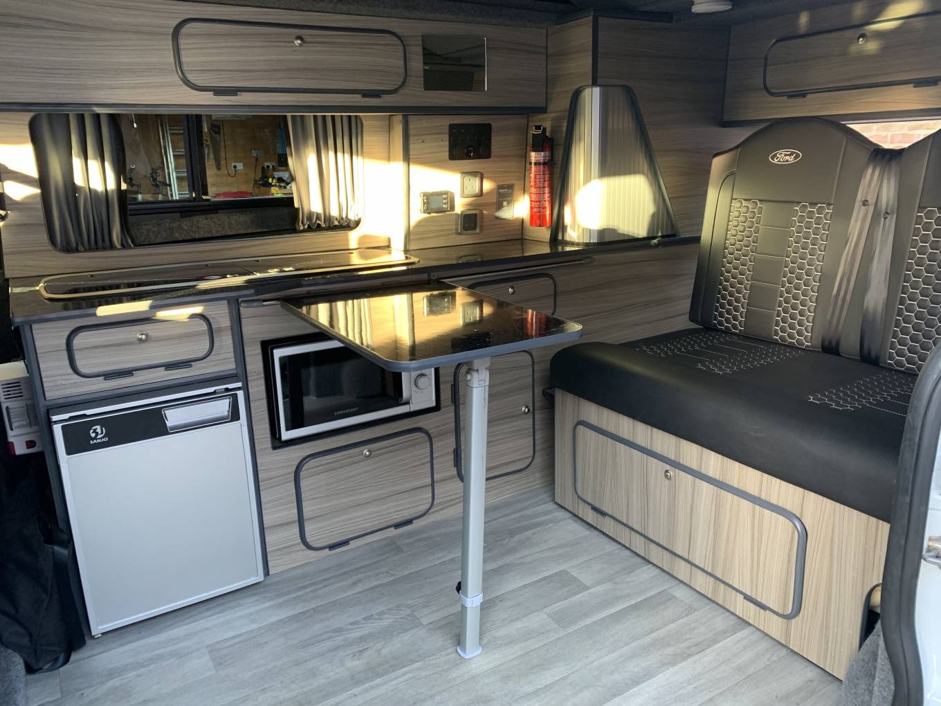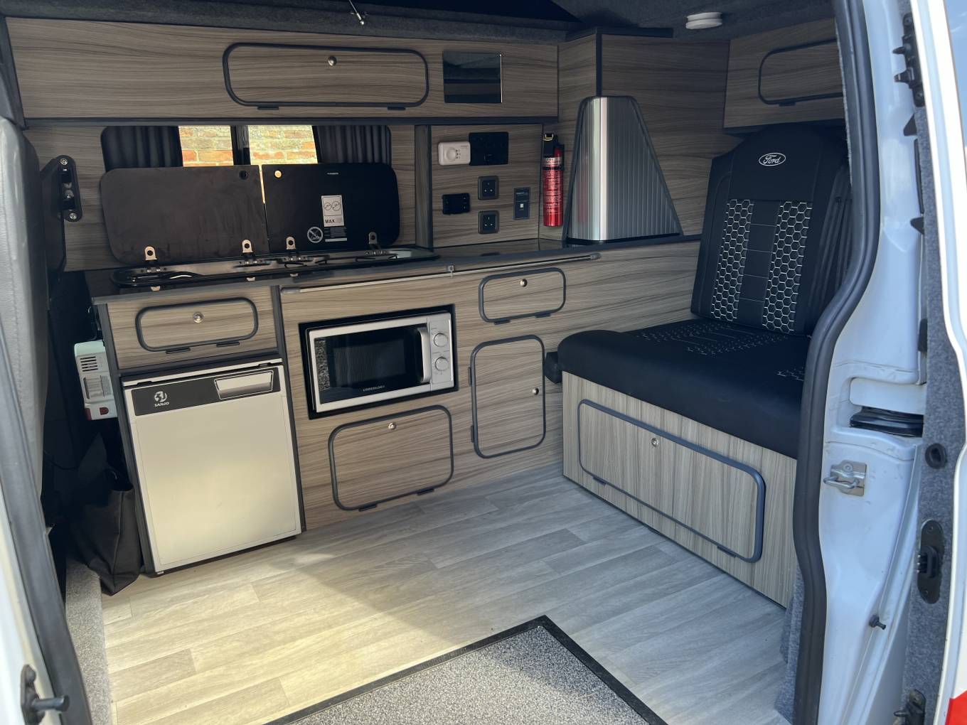 This is a great 4 berth, Ford Transit Custom pop top, professional, campervan conversion. The build quality is excellent, based on a Ford Transit Custom chassis and it’s an ideal campervan or day van, given the 5 seatbelts. Leather upholstery throughout and minimal use by the current owner.